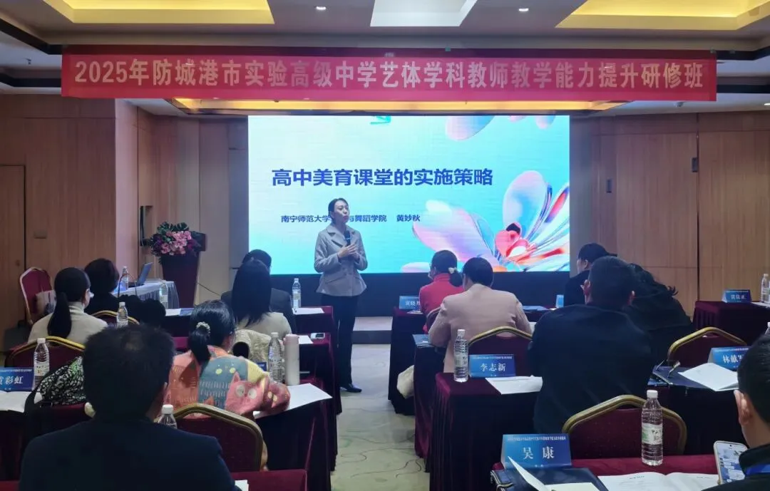 开班仪式后,南宁师范大学音乐与舞蹈学院院长黄妙秋教授为大家带来《高中美育课堂的实施策略》专题讲座。黄教授结合新时代美育要求与教学实例,阐述了美育的内涵与实践路径,为老师们更新教育理念、拓宽教学视野提供了有力指导。