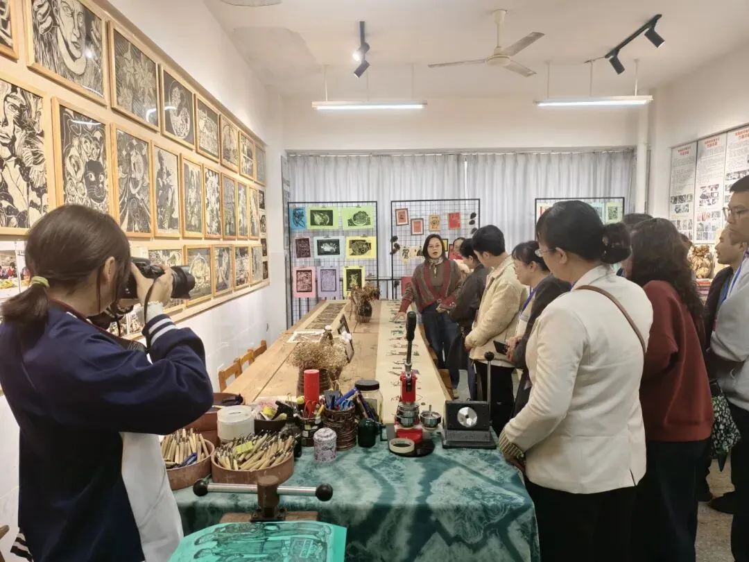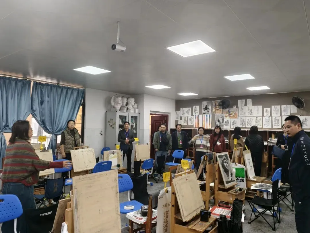 1月16日上午,研修团队走进柳州市第三高级中学。在参观校史馆、深入了解学校发展历程后,老师们重点观摩了美术学科的六个选修课程工作室。油画、版画、岩彩画、陶艺、纸雕、艺术疗愈……丰富的课程设置与精彩的学生作品,展现了三中“以美育人、以文化人”的深厚底蕴。随后,三中相关负责人作了《坚持校本 深化内涵》专题汇报,介绍学校艺体特色课程的建设成效与经验。两校教师还分学科座谈,就课程开发、特长生培养等话题进行了深入交流。