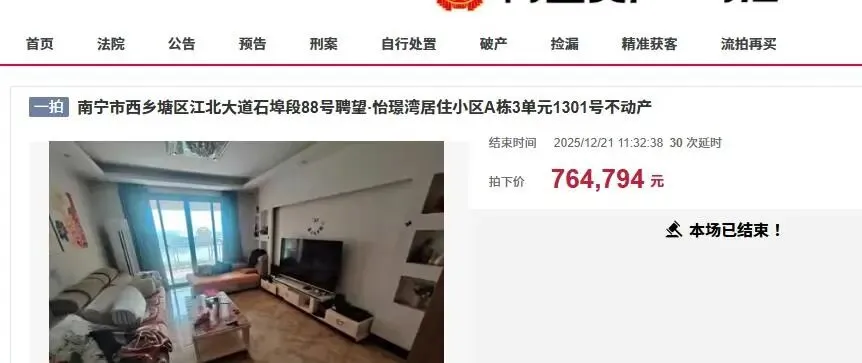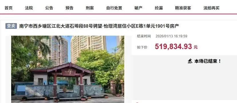 近日,在南宁市司法拍卖市场上,迎来了一宗非常低价的房产拍卖,一套位于南宁市西乡塘区江北大道石埠段88号骋望·怡璟湾居住小区E栋1单元1901号房产再次被拍卖。此次拍卖的骋望·怡璟湾房产,是一个就在南宁市邕江畔的小区,属于一线江景房。房子建筑面积高达141.64平方米,是一套大户型住宅,不过房子具体户型和装修情况不清楚,拍卖公告没有给出这套房子室内实景图。