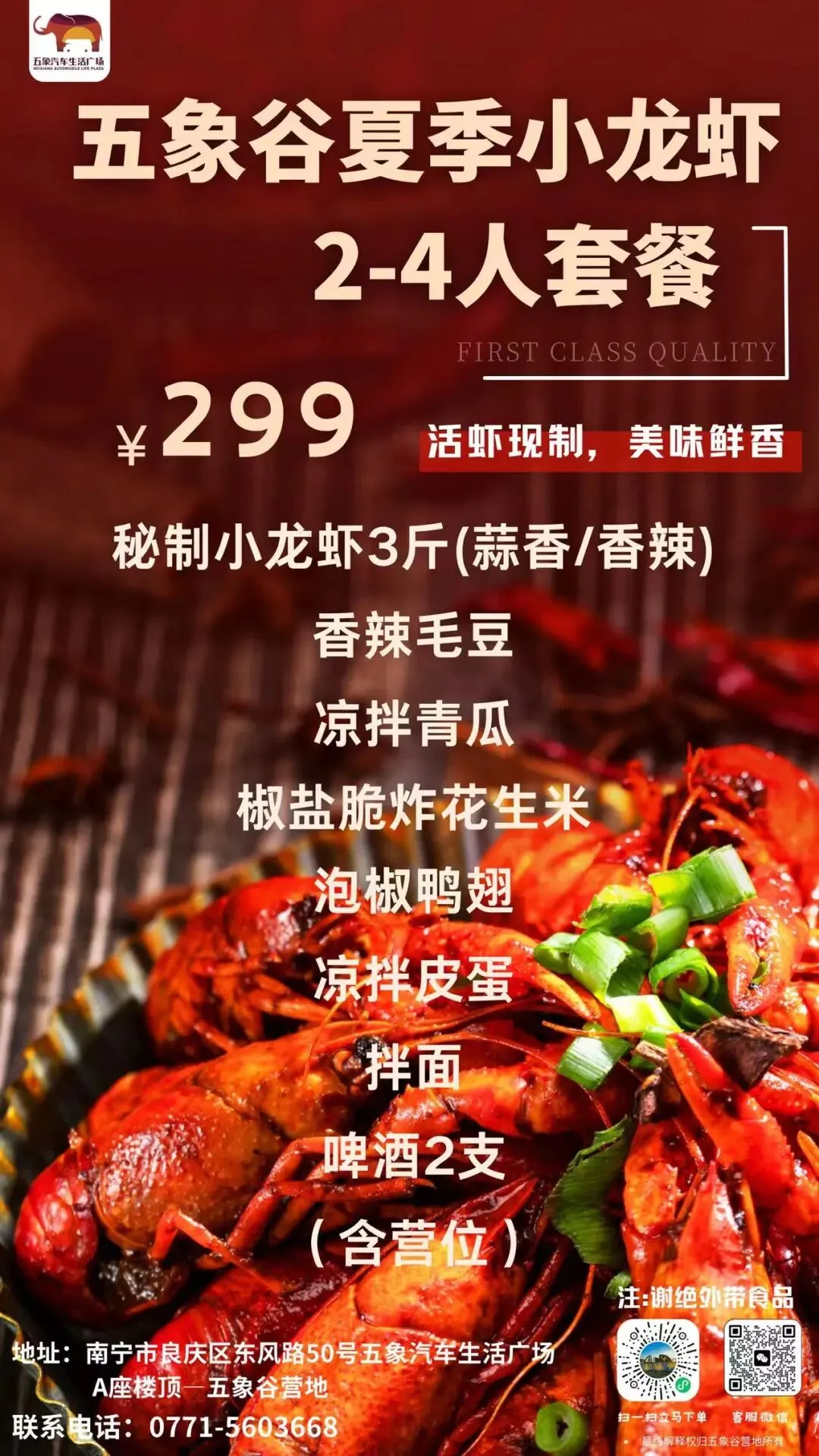 五象谷夏季小龙虾,活虾现制,经过精心烹饪,搭配秘制酱料,独具特色、美味可口。营地特推小龙虾套餐,不仅有小龙虾,还有丰富的配菜,搭配清爽啤酒,让你一次尝遍多种美味!