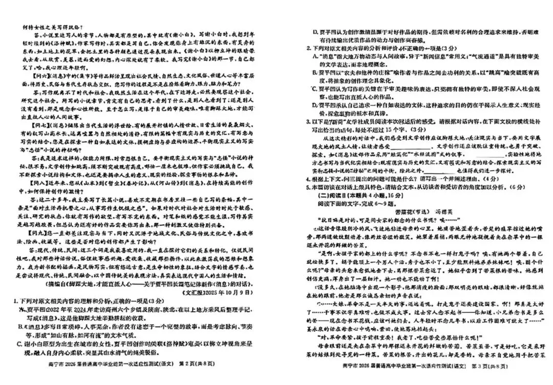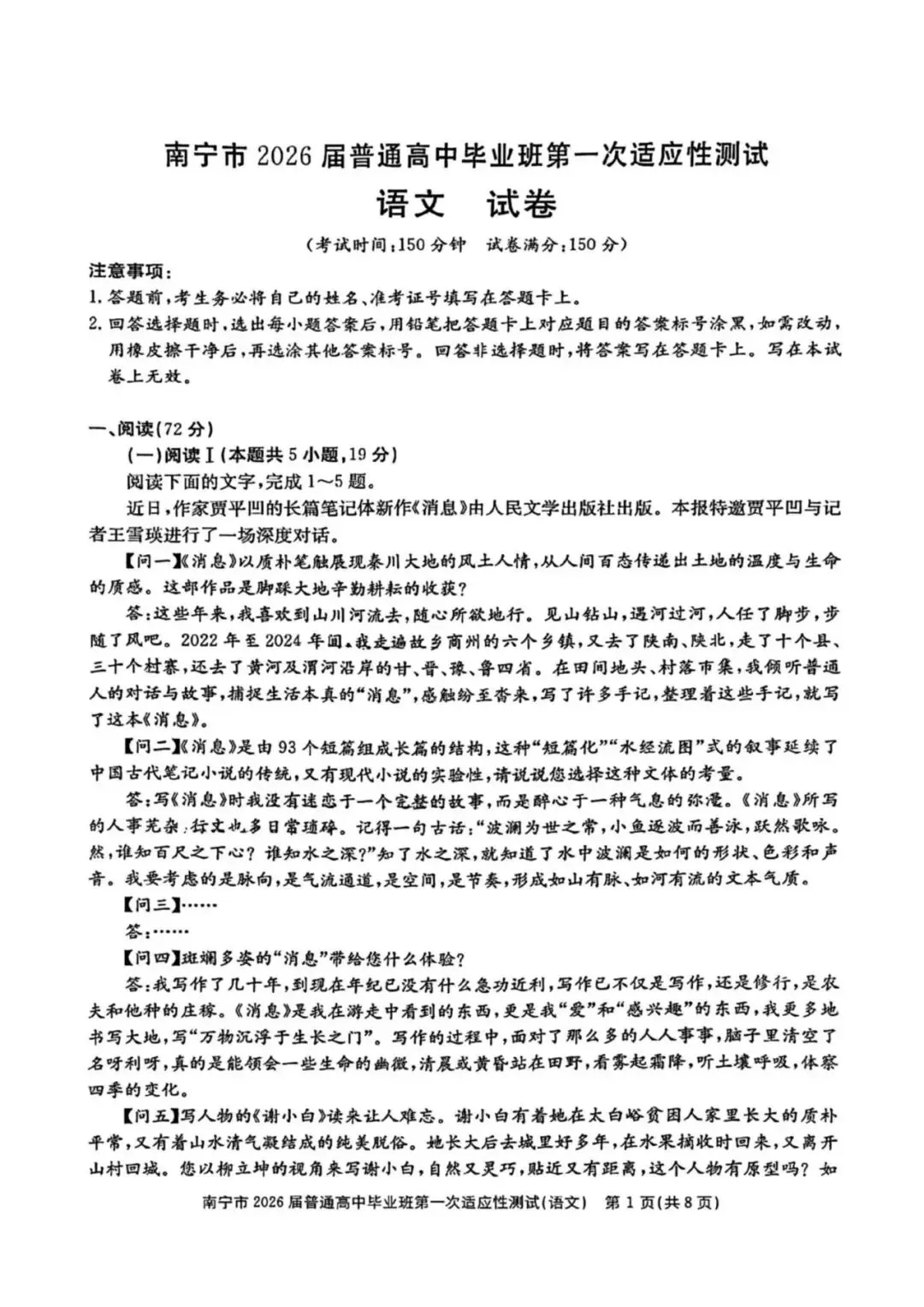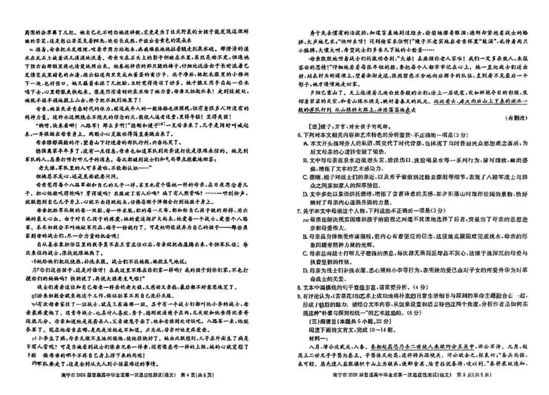 文章内容:南宁高三一模第一次适应性测试语文试卷及数学自做答案!