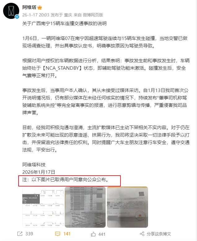 后续的发展却打破了常规剧本。阿维塔没有像不少车企那样,一有事就火速甩出后台数据自证清白,而是先等交警调查,1月17日的正式说明里,明确提到事故是驾驶员超速导致,车辆始终处于【NCA_STANDBY】状态,也就是辅助驾驶未激活。