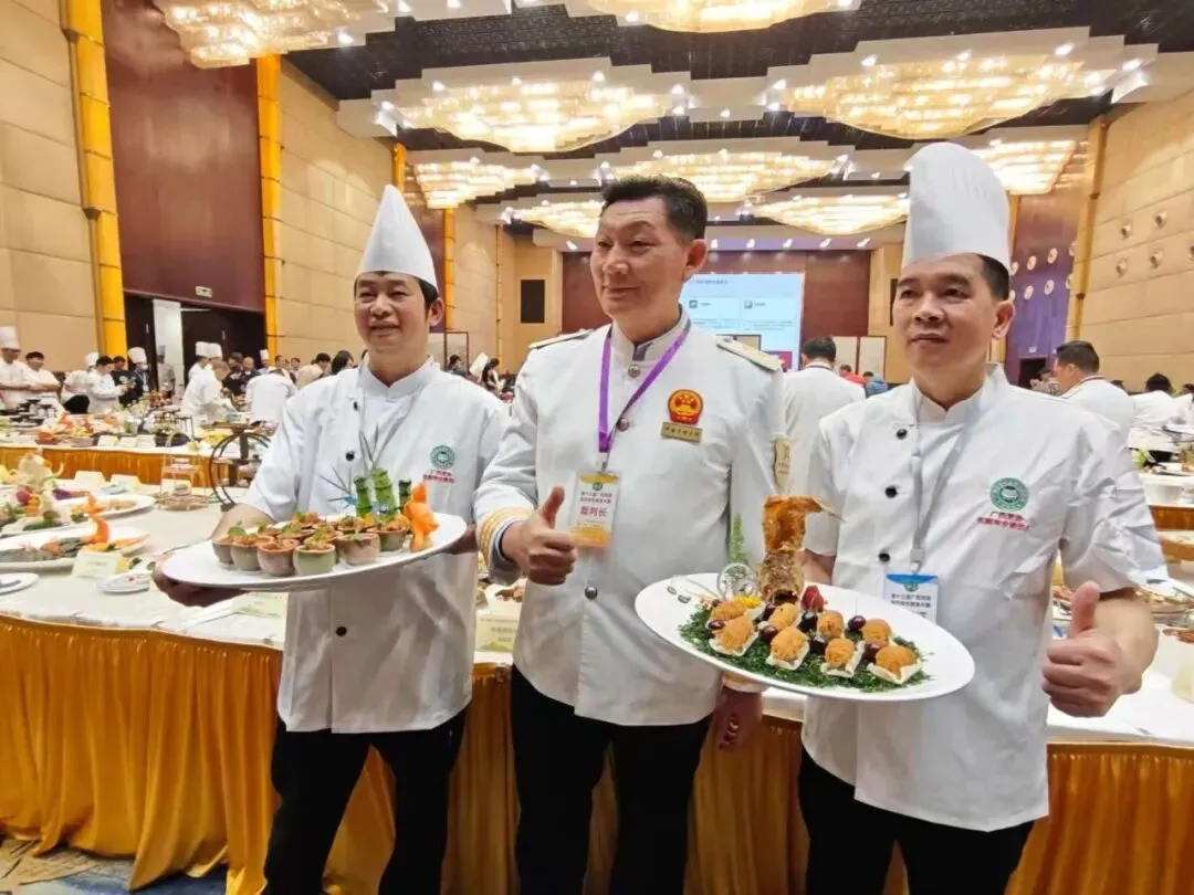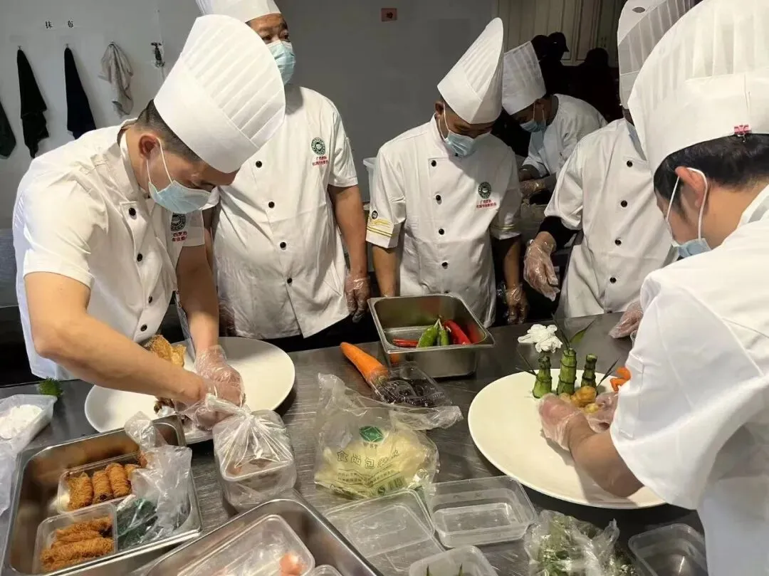 本次大赛采用 “热菜冷评” 的形式,要求参赛单位在场外完成菜品制作与装盘后,送至广西南宁市荔园山庄的指定赛场参评。比赛当日,我校参赛厨师严格遵守赛场纪律,身着统一工作服,规范佩戴帽子、围裙、口罩,以整洁专业的形象亮相赛场。