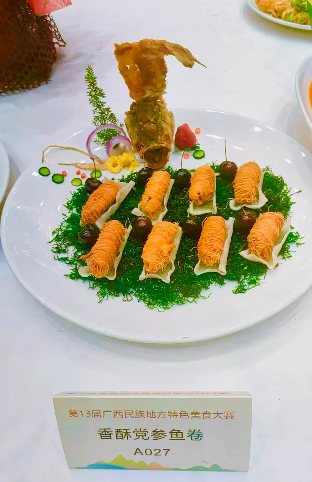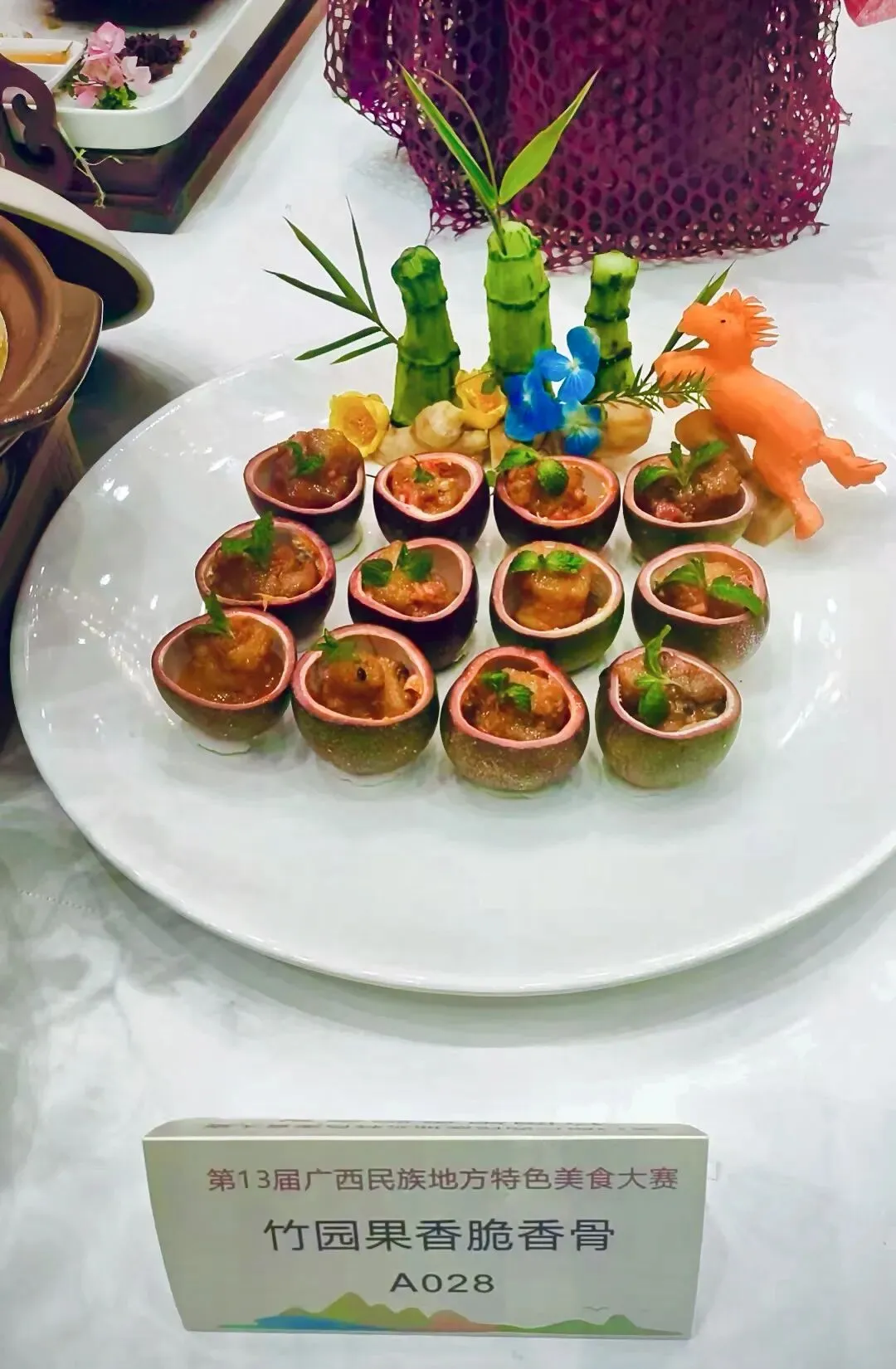 评委们围绕菜品的食材特色、创新亮点、色香味形等维度进行专业评审,我校参赛的 “香酥党参鱼卷” 与 “竹园果香脆骨” 凭借鲜明的广西民族地方特色、精湛的烹饪技艺和出众的风味口感,赢得了评委们的一致认可与高度好评。