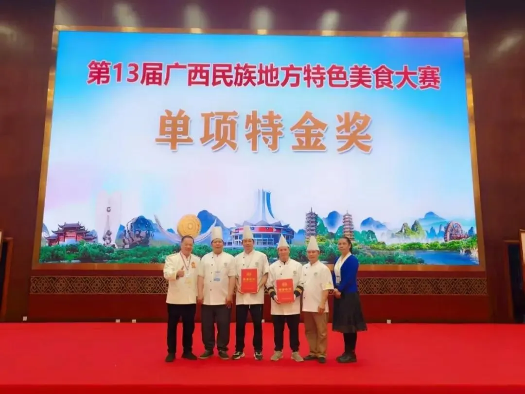 历经赛场淬炼,满载荣誉而归。2026 年 1 月 17 日,纳入国家商务部 “中华美食荟” 的第13届广西民族地方特色美食大赛在广西南宁市荔园山庄圆满落幕。作为广西餐饮行业年度规模最大、影响最广的品牌赛事,本次大赛汇聚了全区各地的餐饮精英。南宁市第二十四中学食堂厨师组共派出两支参赛小队出征,凭借地道的广西风味与扎实的烹饪功底崭露头角,最终两队双双斩获金奖,用实力书写校园后勤服务工作者的专业风采。
