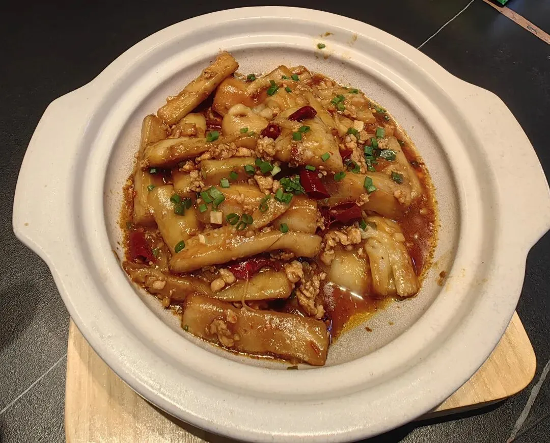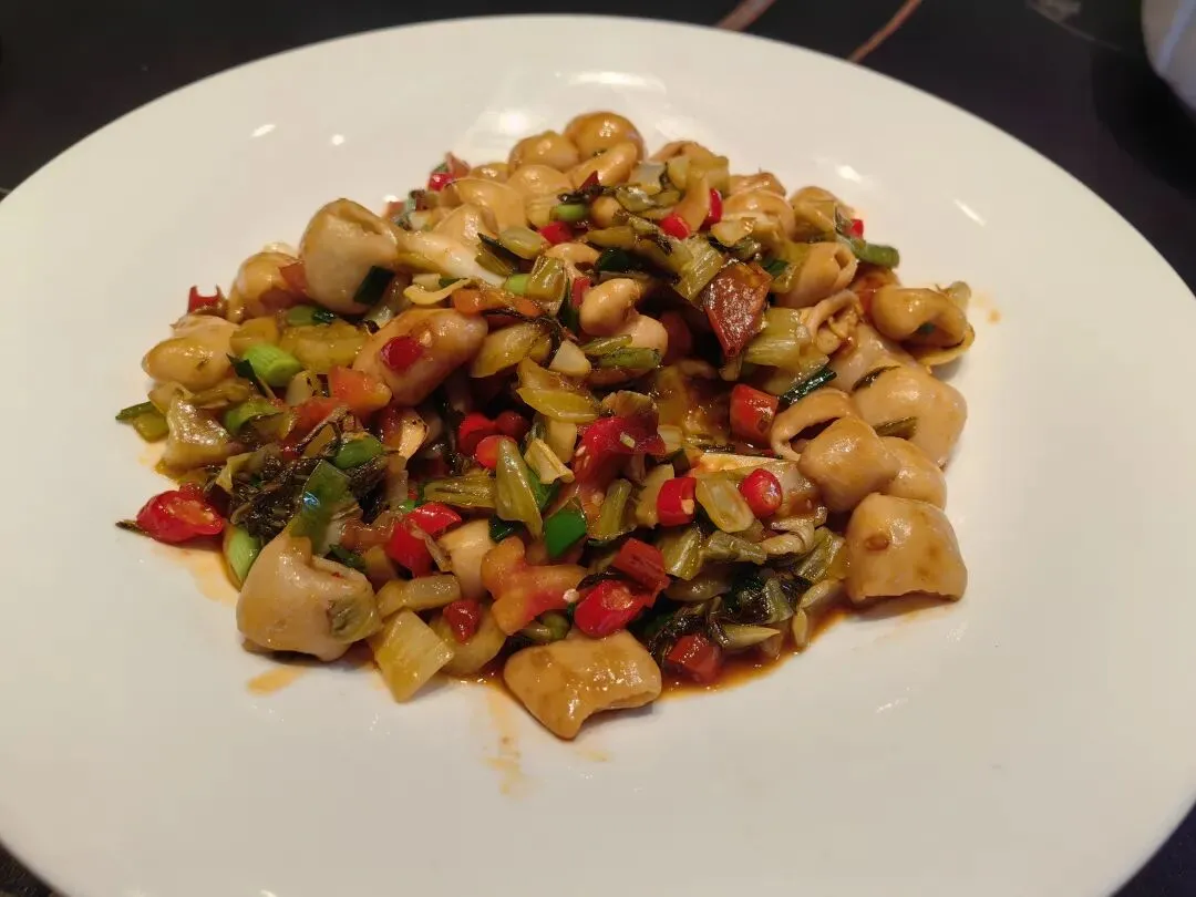 看我们去路边摊吃快餐,首点糟辣罗非鱼之类,正源轩亦推出自己版本的红烧罗非。操作流程一致,关键在鱼新鲜,煎得好,再调馔就水到渠成,可知食材新鲜是第一位,不少快餐小炒为节省时间,一次备料过多,入了冰库,再整饬就不是一个味了。正源轩难得用罗非鱼,颇有牛刀小试感觉。 柳州版本,用番茄、红椒、酸豆角,鲜香酸辣。鱼极来味,头亦被我吃去。 黄豆焖鱼仔。番茄青椒焖一会,不用酸笋,这菜美味,得赶紧下手,转两圈过来鱼仔就没有了。曾有教训,不得不防。 肉末茄子。烹制后装煲,可保温,比小炒店是要讲究的。食友言最喜此菜,只是有罪恶感,为何?油大故。有厨师视频教学,满满一锅油炸茄子,复再煎焖,说按此法少吸油。我沉默许久,清蒸茄子,我信。 炒空心菜梗。素炒,少盐,以番茄微酸调少许味。若加水煮,多软烂,少水来煮,则清脆,法无定法。正源轩以粤式烹制,断不会有多菜汁。 这个酸菜大肠美妙啊。酸菜咸脆,大肠软嫩亦脆,食之有味,下饭神品。广西习惯把腌菜统称为酸菜,或还可有广义狭义之分,古时统称“菹”,而后再慢慢衍化分化。所以酸菜并非只酸,也有只咸不酸的,叫咸酸菜,香港人说咸酸菜炒牛欢喜是定律。柳州习惯炒大肠,或牛肉,大概也是本土定律。雅士喜食,会说好吃;酒肉伧夫亦喜食,会说洗得太干净。 重点是干炒牛河,肉用牛肉或鸡杂。我以为柳州此类炒粉无出其右。其粤式标准精确到韭黄青葱豆芽,撒白芝麻,无多滴油,无不润色。 南乳炒番薯苗。这次素炒用了腐乳,典型南派风格。粤式炒青蔬,尤擅长油水混合之妙,既软且脆,既熟且翠,形色之制,务留原味。这也是美学于烹饪中延伸。 是日炒粉两碗,白粥一碗。妥帖。