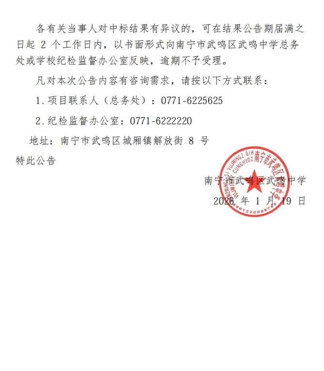 >南宁市武鸣区武鸣中学文具用品定点采购询价比选结果公告