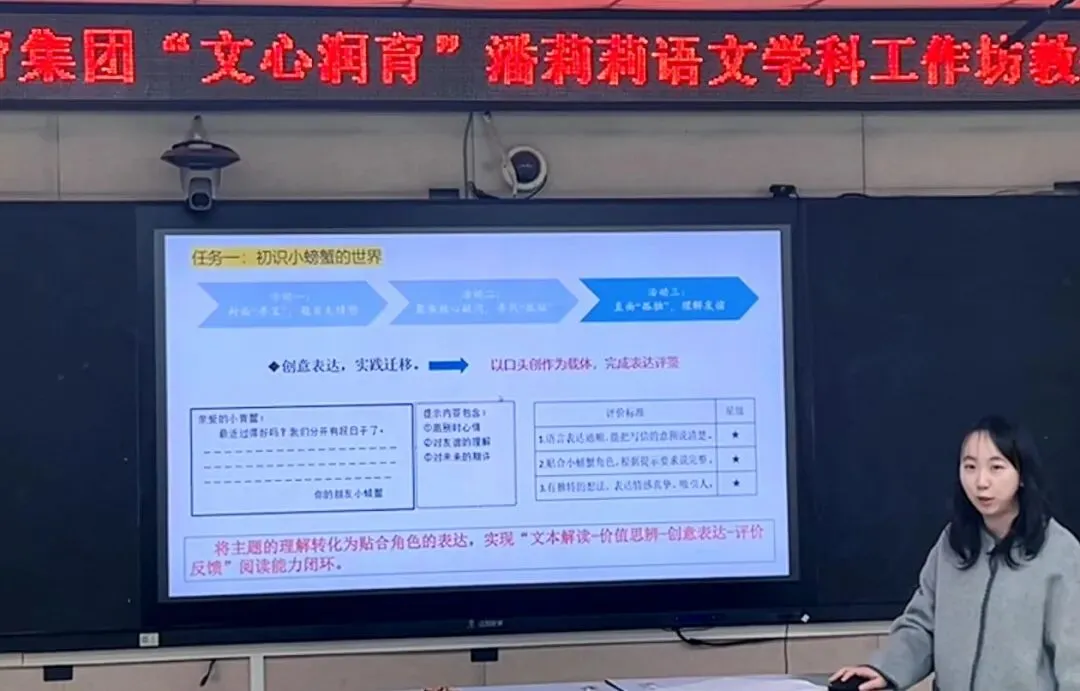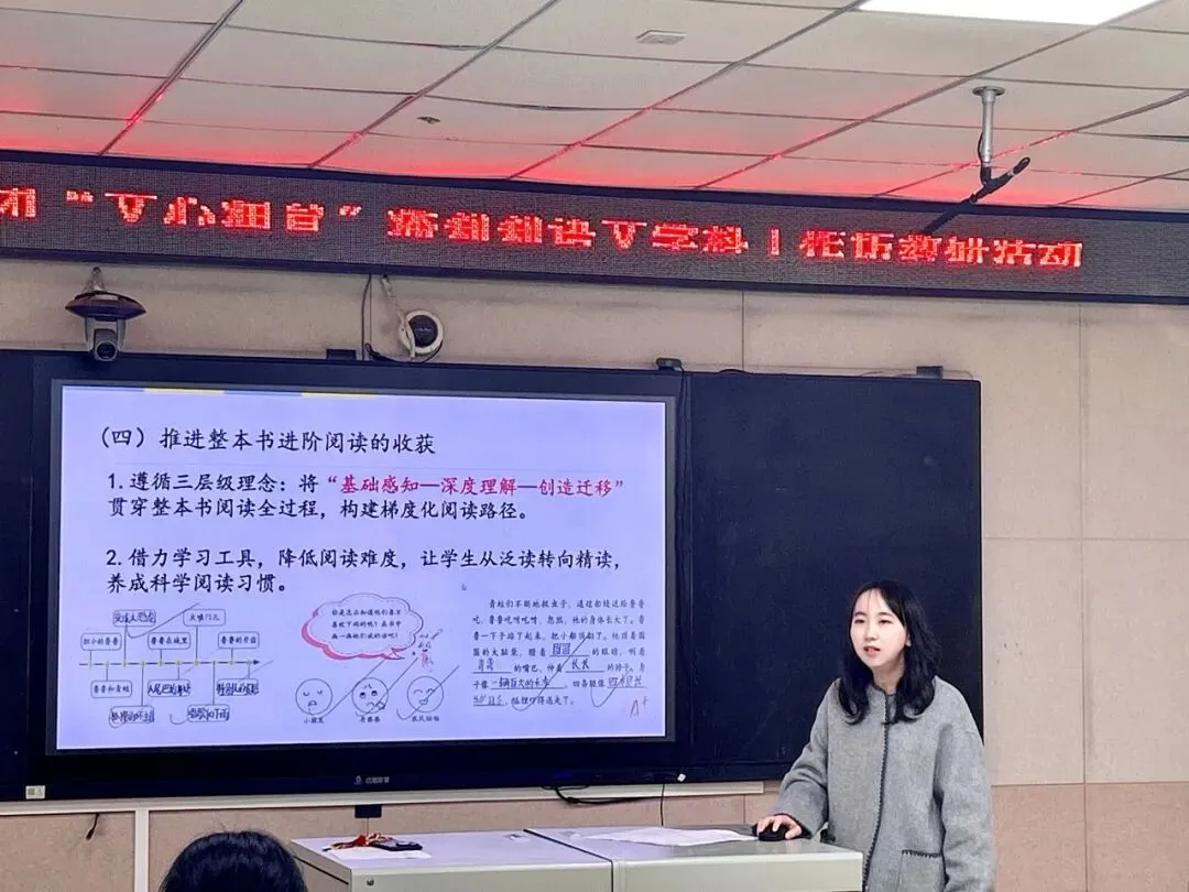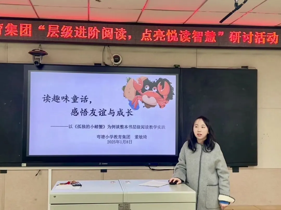 活动伊始,弯塘小学教育集团本部教导处副主任董敏琦老师以《孤独的小螃蟹》层级进阶整本书阅读教学为例,带来了题为“读趣味童话,感悟友谊与成长”的主题分享。董老师立足2022年版语文课程标准对低段整本书阅读的要求,结合低年段学生的认知特点,从解码、评鉴、创造三个层级,围绕"孤独"主题构建层级进阶阅读教学路径,让低年级学生在梯度化学习中读懂孤独、悟透友谊,落实核心素养培育目标。