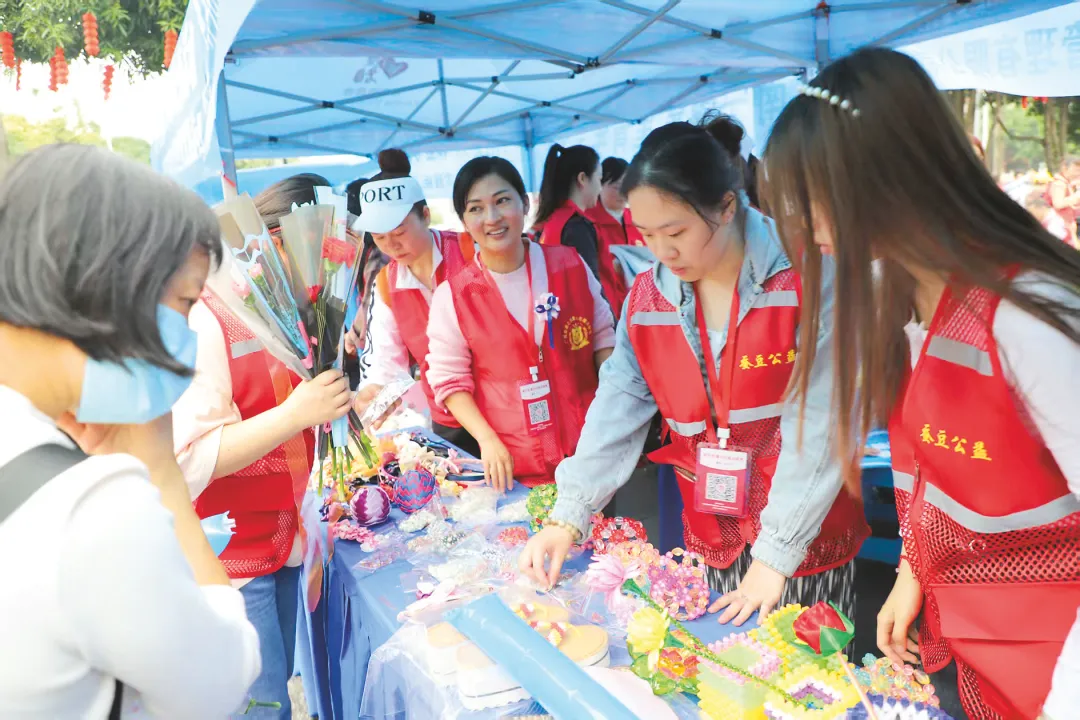 在南宁市朝阳印象城的“蚕豆工坊——豌豆织物”非遗织物售卖点,残疾人小李正有条不紊地忙碌着:顾客驻足时,她热情介绍五彩缤纷的毛线钩织品;稍有闲暇,就会坐下继续钩织可爱的玩偶。“以前总觉得自己什么都做不了,现在能自食其力,心里很踏实。”她一边包装顾客选中的挂饰,一边笑着说。志愿者积极参与“蚕豆公益”活动,现场进行残疾人手工艺品爱心义卖。 (市残联供图)