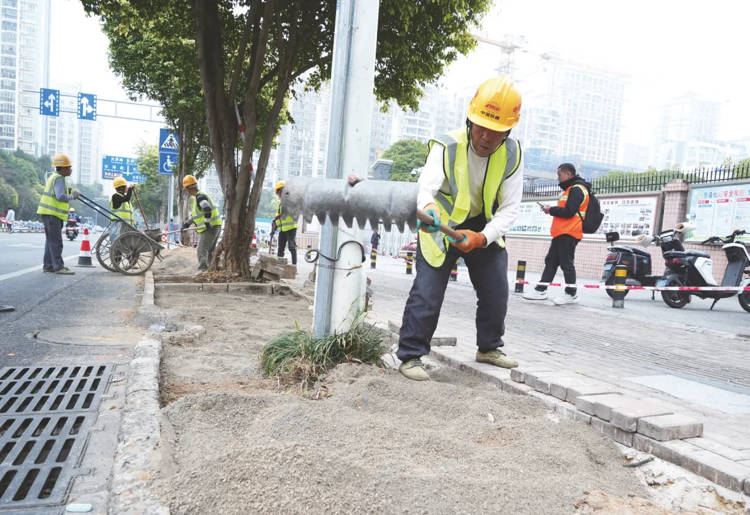 校园周边通行难题是民生关注的焦点。针对上下学高峰时段人流量大、空间紧张的问题,南宁市绿化工程管理中心近期对群众反映强烈的重点区域进行系统摸排和分类整治,通过“小微改造”优化城市慢行空间,保障学生上下学的安全与便利。施工人员对地面进行硬化铺装。记者 刘增璇 摄