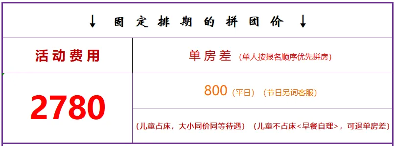 平日。活动集合前15天(不含),扣除团费总额1%;活动集合前15天至11天,扣除团费总额25%;活动集合前10天至8天,扣除团费总额50%;活动集合前7天至4天,扣除团费总额95%;活动集合前3天及以内则全损。(另与客服约定的,按约定执行)