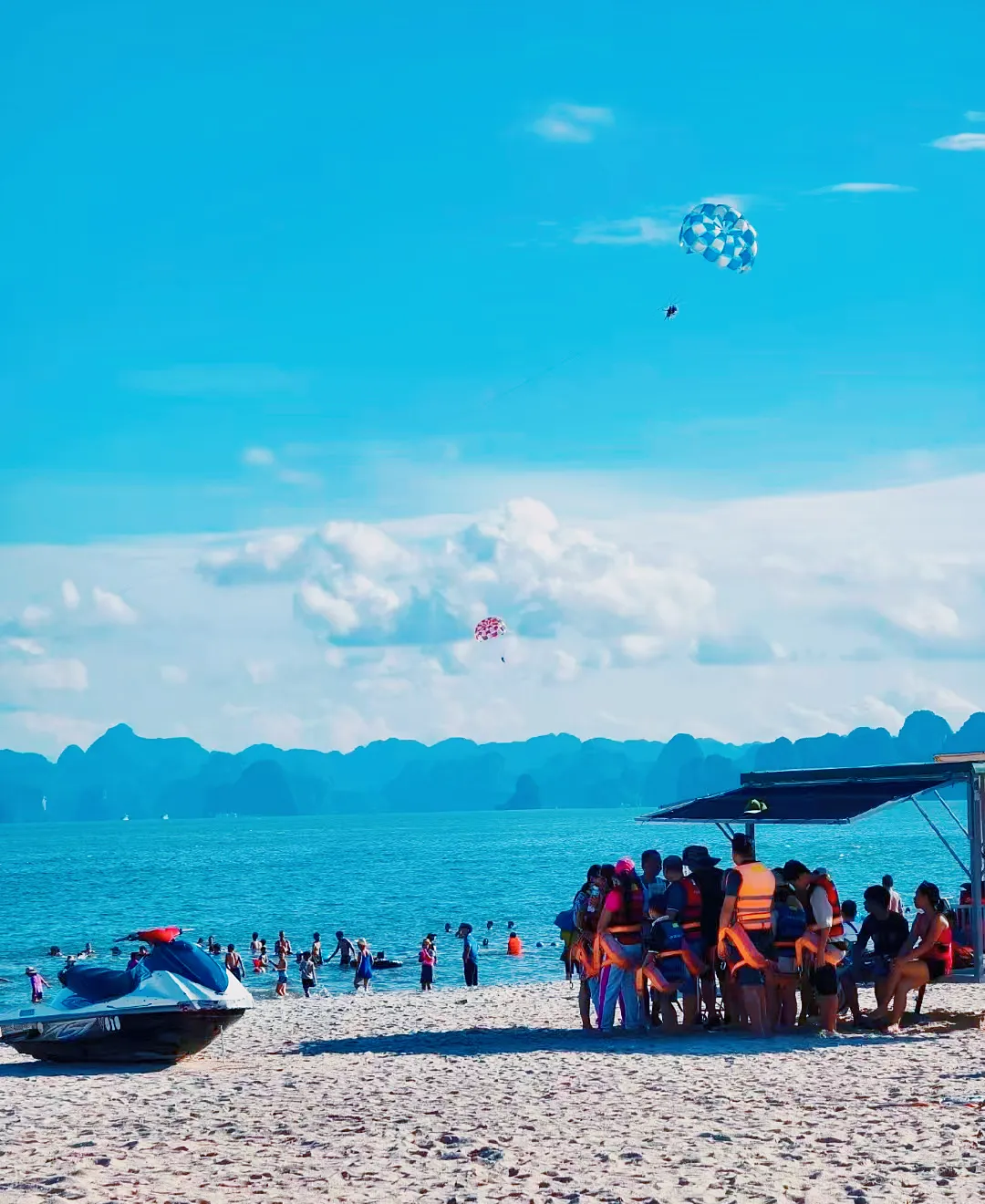 鸿基沙滩,沙滩上椰树成林 , 沙滩细白软暖 ,沙滩一望无际 ,与下龙的喀斯特地貌结合在一起仿佛一面油画, 山的安静 ,水的静谧 ,海的广阔 ,风的抚摸 ,在这里演练这各种变幻 ,当你踏上沙滩的这一刻 ,感受这大自然的安抚把身边的琐事都放下了 ,犹如这一片空旷的白皙 ,难于言表的美。经过千百年的筛炼 ,沙滩格外松软湿润 ,海面安静温柔。