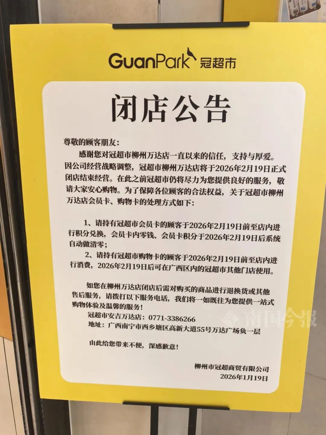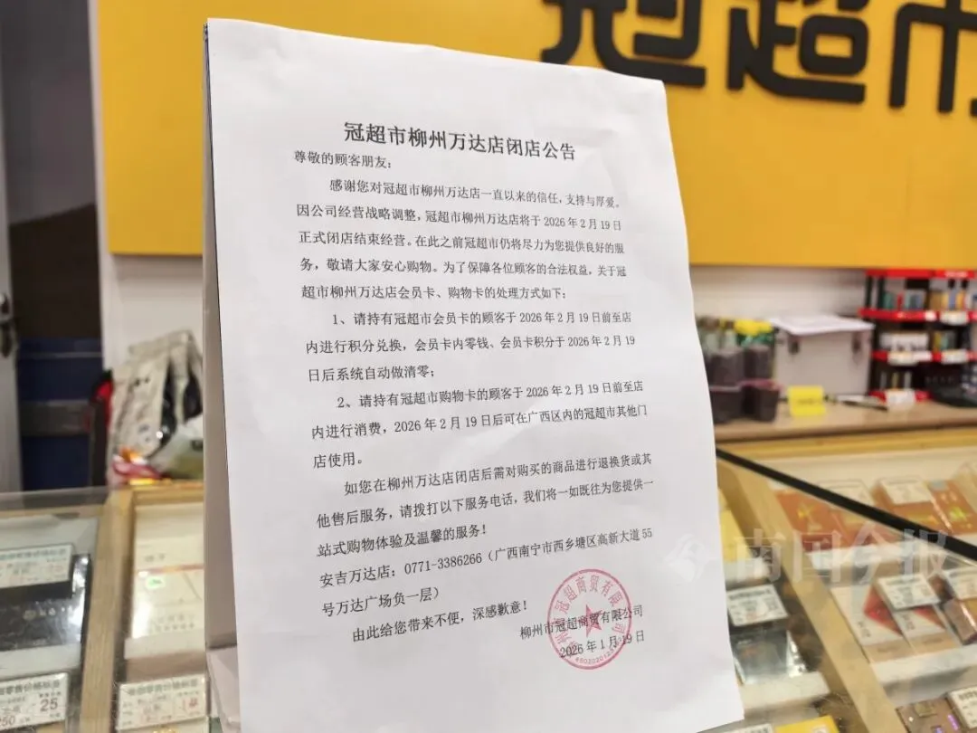 1月19日,位于柳州城中万达广场的冠超市门店贴出《闭店公告》,称因公司经营战略调整,将于2026年2月19日正式闭店。公告还就超市会员卡、购物卡及商品售后的处理方式作了说明。