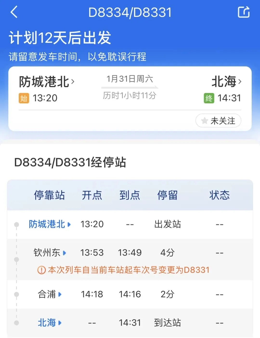 2、 D8334/D8331次(防城港北→北海):13:20从防城港北站始发,经停钦州东站(停留4分钟,车次变更为D8331)、合浦站(停留2分钟),14:31终到北海站,全程1小时11分钟。