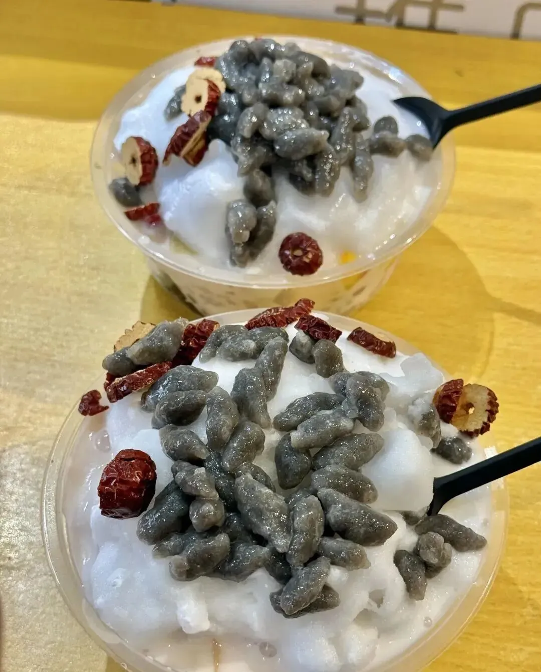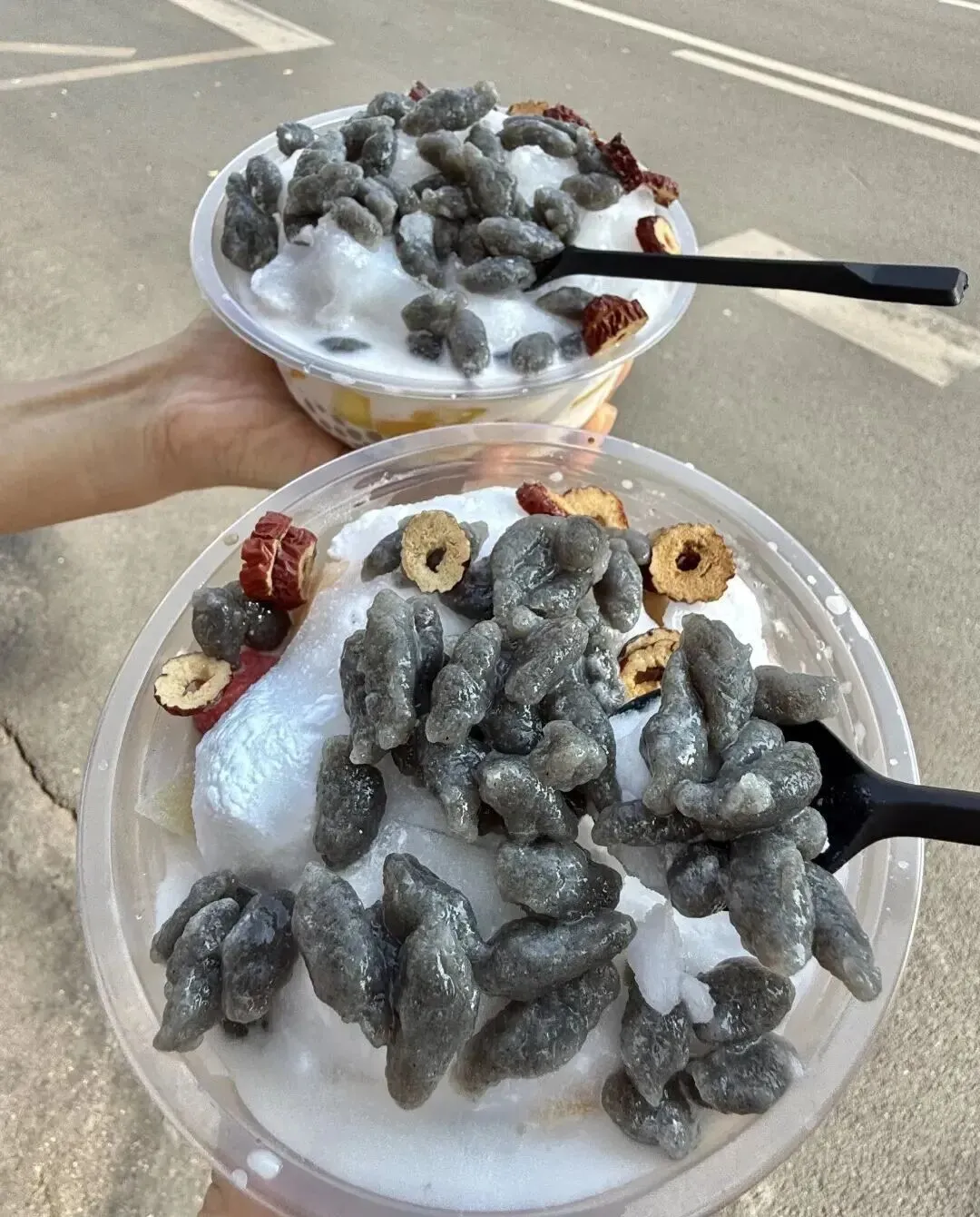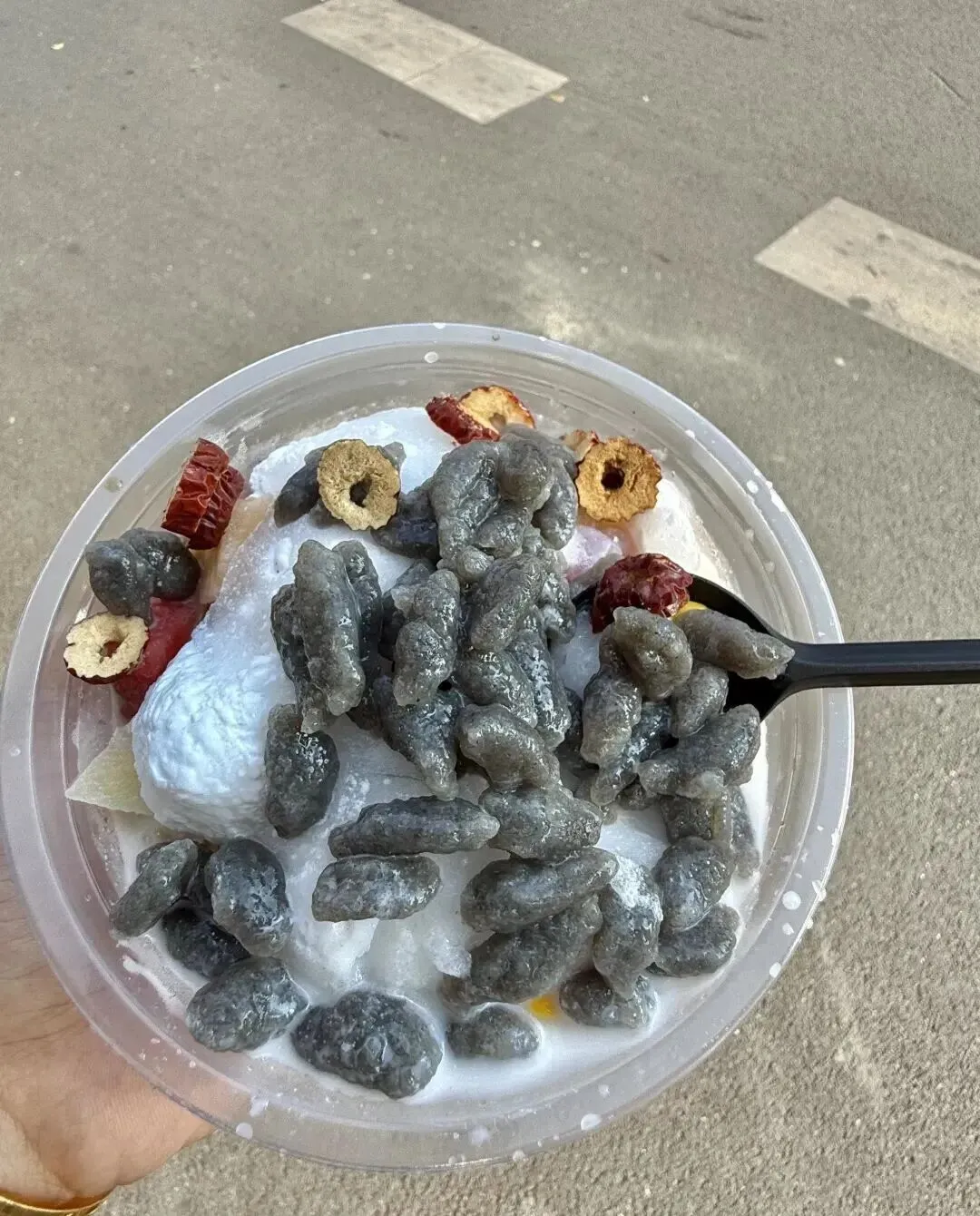 勺子一挖下去 , 好家伙 , 料多到勺子都插不进去 , 西米、芋圆、红豆、薏米、椰果 , 还有好几样我叫不上名字的东西。
