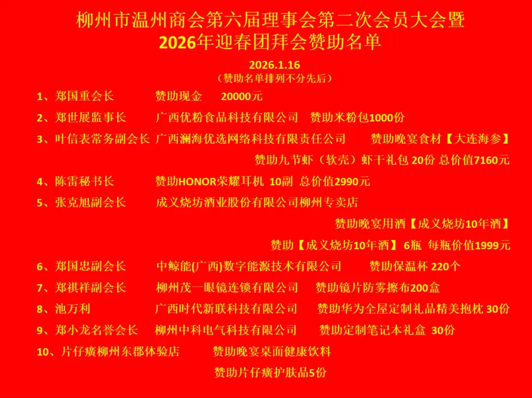 相信在商会领导班子的带领下,在全体会员的共同努力下,柳州市温州商会一定能够在新的一年里取得更加辉煌的成就,为促进柳州和温州两地的经济交流与合作做出更大的贡献。