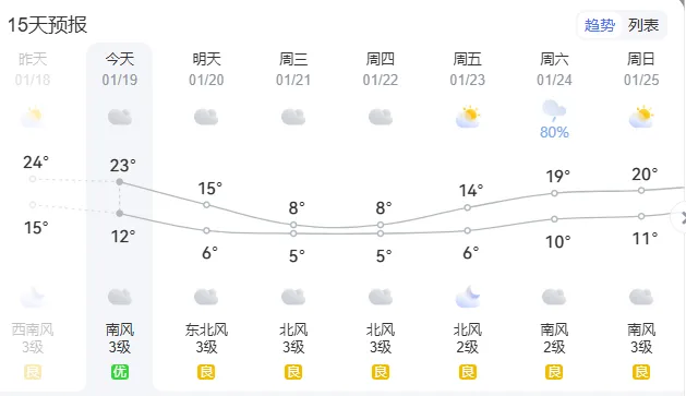 南宁市气象台预计,20日白天,南宁城区阴转短时小雨,南转北风2至3级、阵风5至7级,气温从19℃逐渐降至12℃。