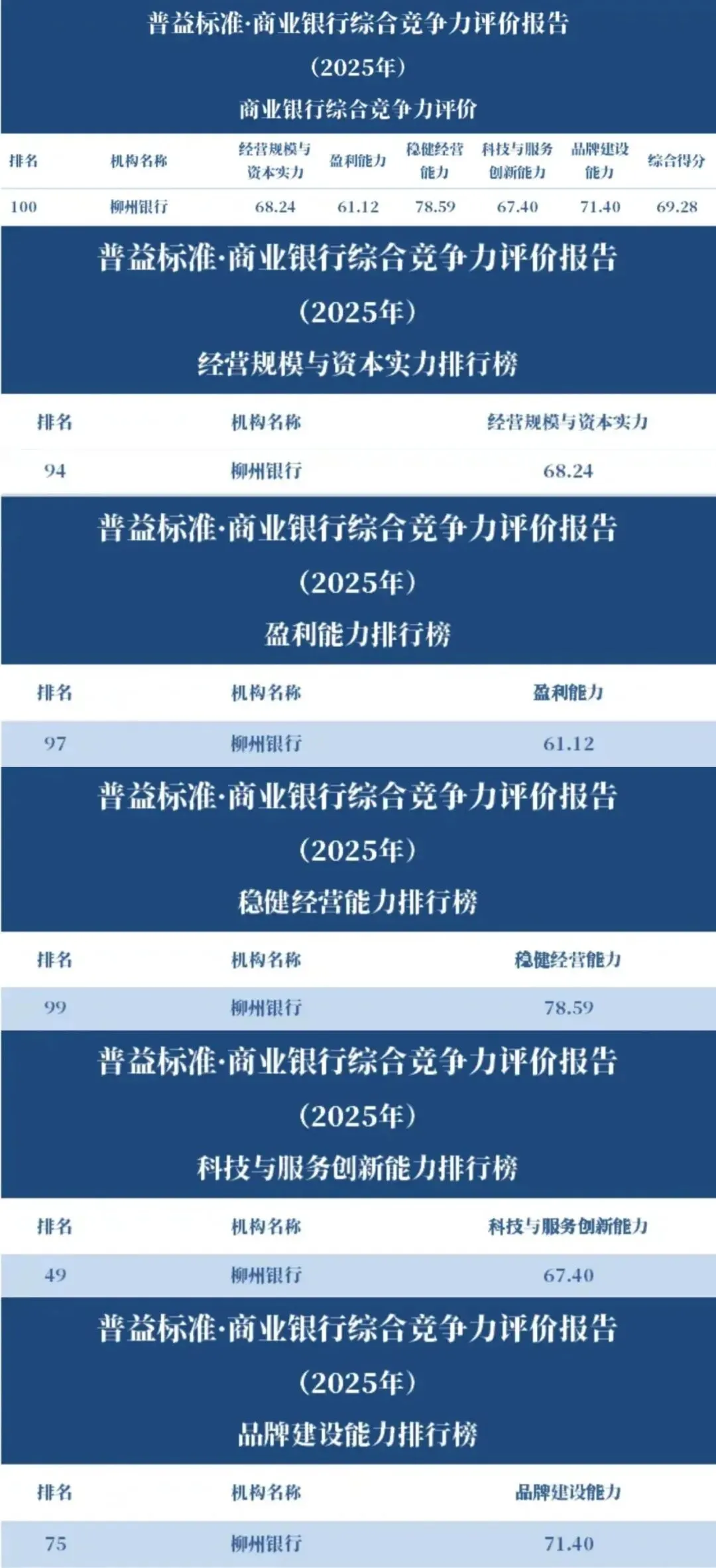 12月30日,普益标准发布《商业银行综合竞争力评价报告(2025)》,本次评价报告以全国的商业银行2024年数据、资料为主要依据,对国有控股银行、股份制商业银行、城市商业银行、农村商业银行进行了系统性评价,柳州银行凭借差异化发展优势与稳健经营表现,成功入围综合竞争力百强榜单,位列第100名。