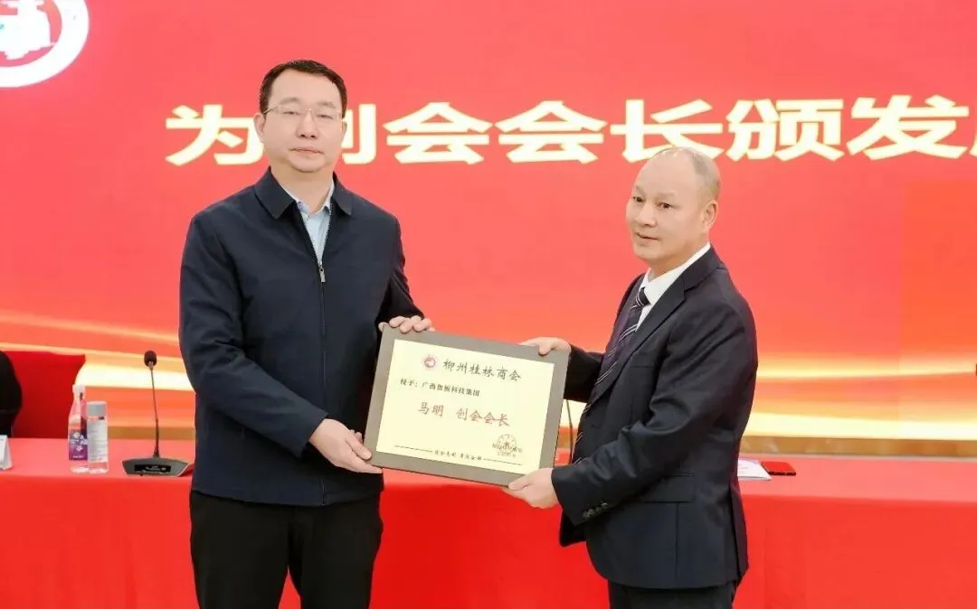 柳州市工商联党组成员、副主席、柳州市总商会副会长刘洪生(左)为第一届会长马明(右)颁发“创会会长”牌匾,感谢他为商会奠定的坚实基础与多年来的无私奉献。