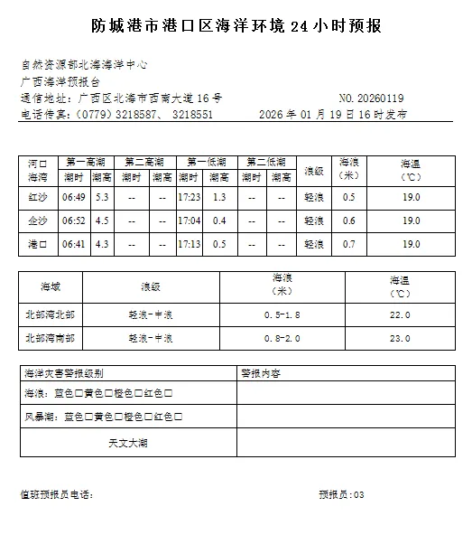 >2026年1月19日防城港市港口区海洋环境24小时预报