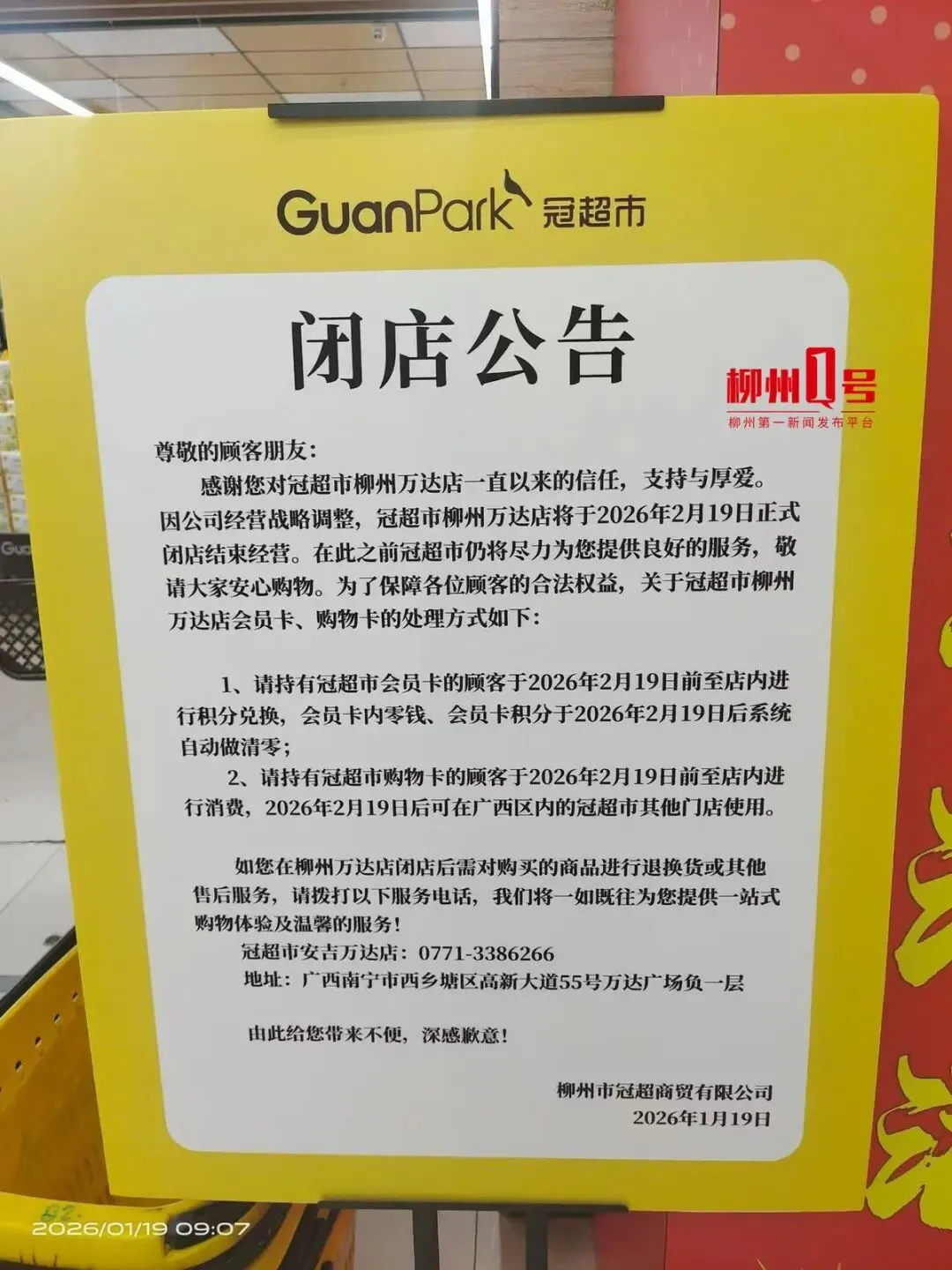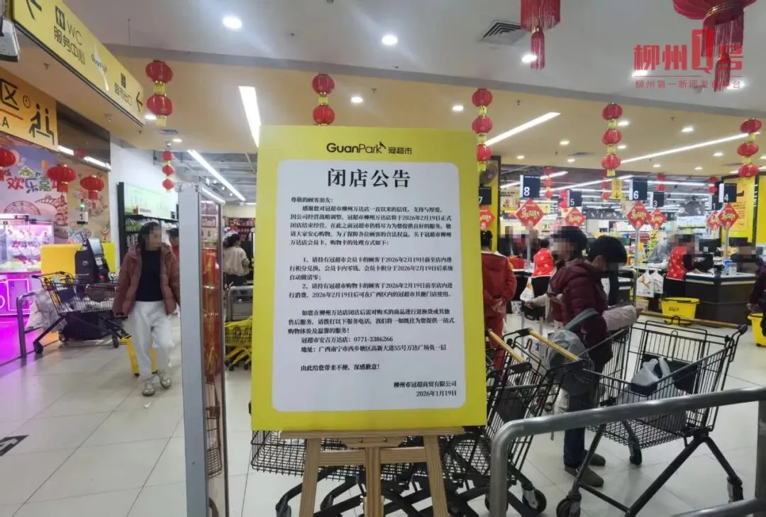 1月19日,微姐通过电话核实了解到,位于柳州城中万达的冠超市门店因公司经营战略调整,将于2026年2月19日正式闭店,结束经营。