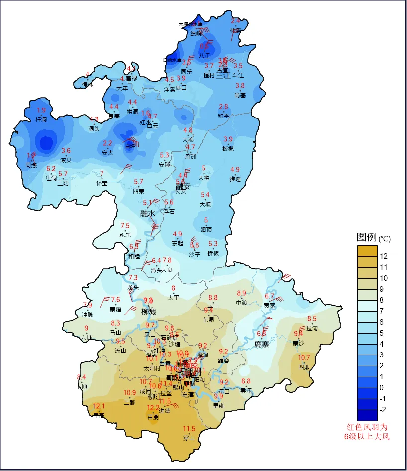 据柳州气象台消息,2026年1月19日7时-20日7时(24小时),受南下冷空气影响,我市阴天有小雨,出现了6级以上偏北大风。根据全市气象站资料统计,最低气温0~4℃的有46个站,≤0℃有7个站,最低气温-2.8℃(三江大塘坳水库,20日6:51)。极大风≥6级的有28个站,其中≥8级有1个站,最大为19.9米/秒(鹿寨龙兴电站,8级,20日0:33)。