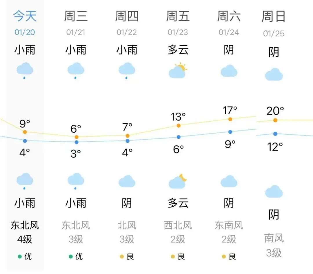 预计20日白天到晚上,全市阴天有小雨,北部高寒山区有冻雨、雨夹雪或道路结冰。北风3~4级、阵风6~7级;最低气温:高寒山区-4~0℃,其余地区0~4℃。最高气温:高寒山区0~2℃,3~9℃。