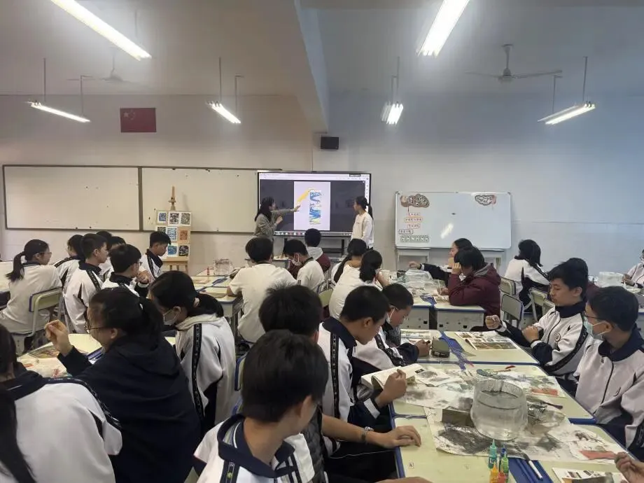 主管信息处的黄晶副校长以及美术组全体教师全程参与了听评课,大家对美术组彭雨昕、王海名两位年轻教师的两节AI课《国色新尚——柳州色彩名片文创设计》、《标志设计——AI班徽》给予高度评价。黄晶副校长也提出兼具实操性与指导性的优化建议,为后续AI与美术教学的深度融合、校本课程的打磨升级指出了方向