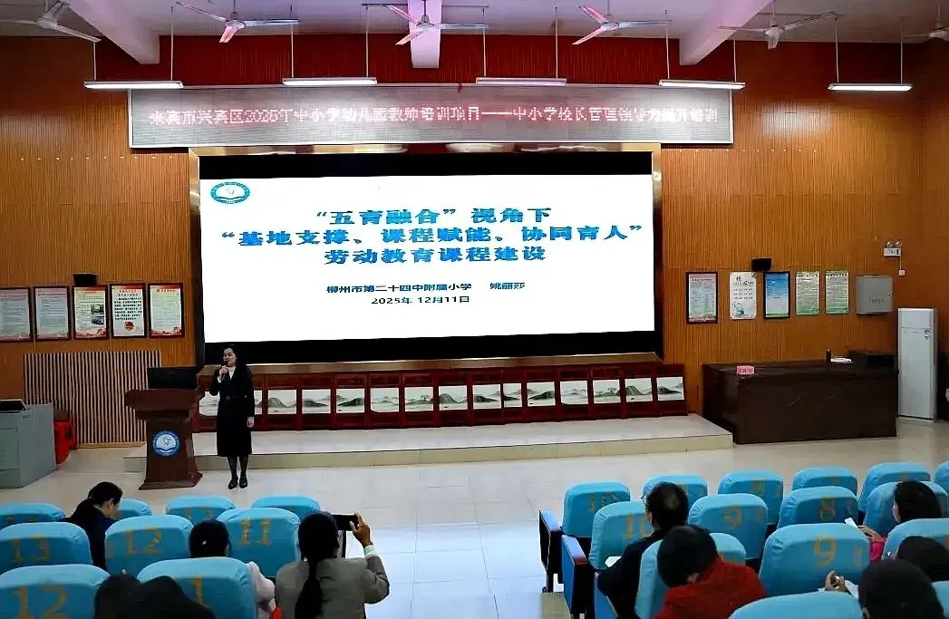 柳州市第二十四中附属小学执行校长姚丽莎以《“五育融合” 视角下 “基地支撑、课程赋能、协同育人” 的劳动教育课程建设》为题,从基地建设、课程研发、协同机制三个维度,系统阐述了学校劳动教育的特色发展路径,为劳动教育的落地实施提供了可借鉴的实践范本。
