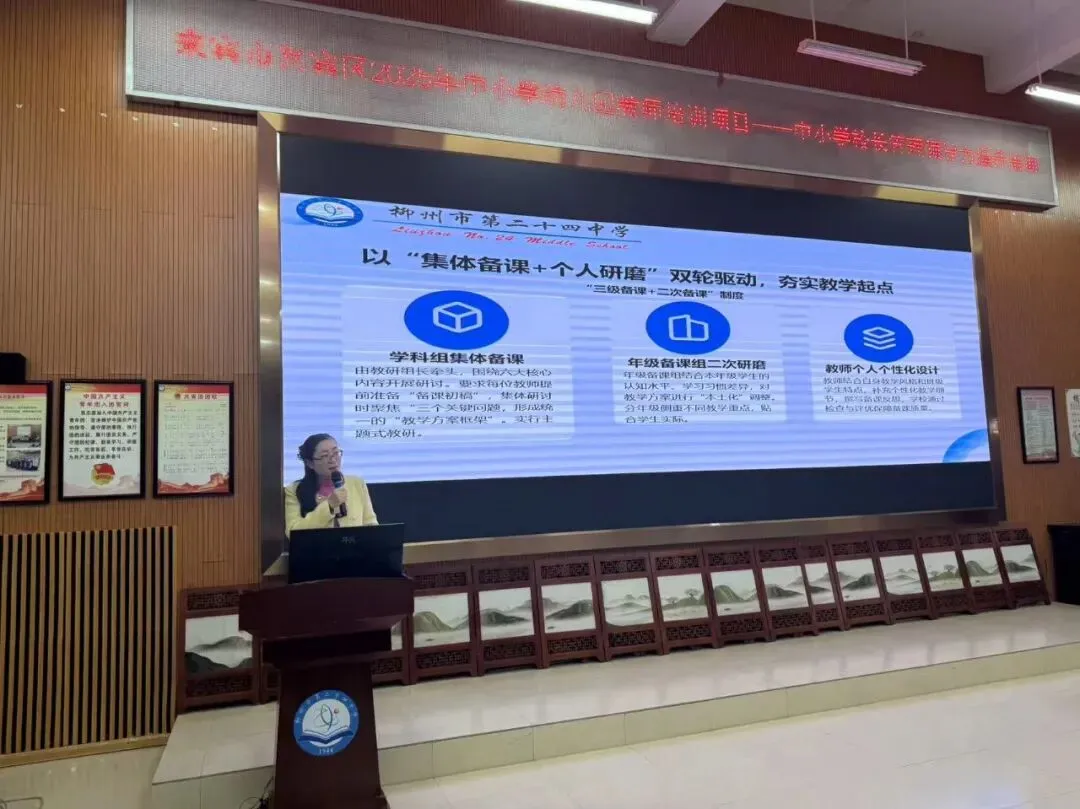 为深化教育管理经验交流,促进区域教育协同发展,近日,来宾市兴宾区 2025 年中小学幼儿园教师培训项目 —— 中小学校长管理领导力提升培训班的 67 位教育教学副校长,齐聚柳州市第二十四中及附小开启了一场深度研讨与经验分享的教育盛宴。本次活动由柳州市第二十四中附小科研副主任金明珠主持,内容丰富、形式新颖,为与会同仁搭建了互学互鉴的优质平台。