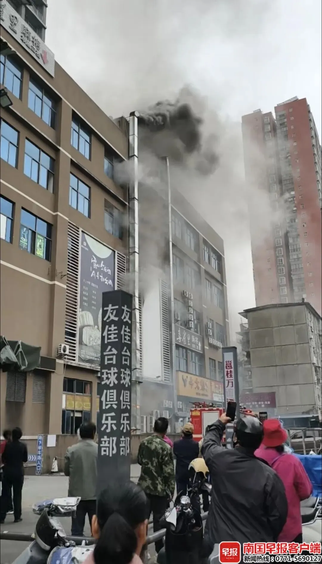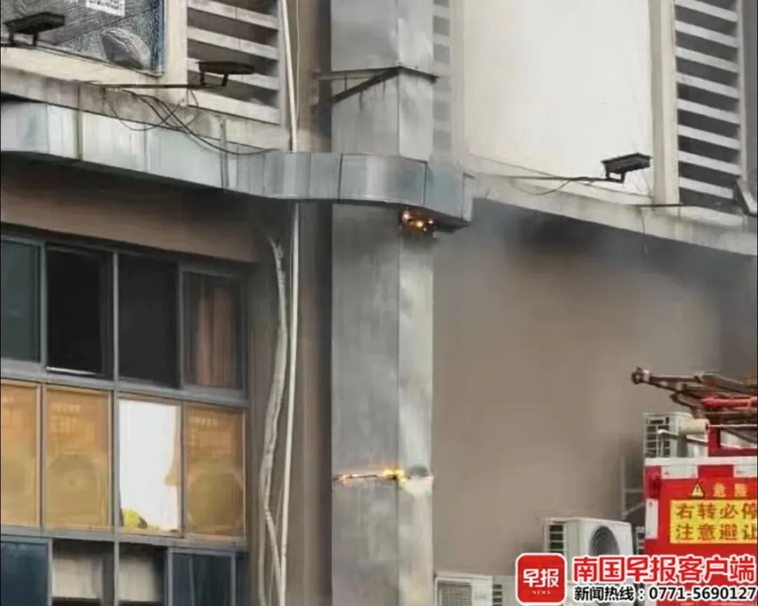 当天上午9时50分左右,南国早报全媒体记者在现场看到,起火建筑外立面可见明火,顶部持续冒出黑烟,空气中弥漫着刺鼻的焦糊气味。多辆消防车已抵达现场,消防救援人员架设水枪对准起火建筑进行喷射。随后,医护人员也赶到现场待命。