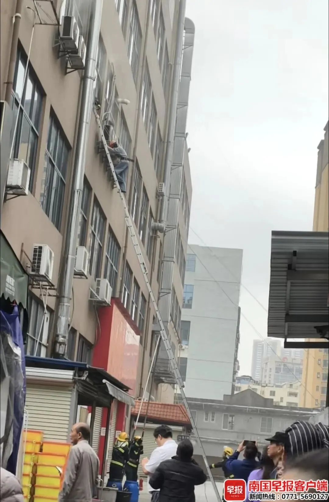 1月20日上午,南宁市西乡塘区北湖北路一栋建筑发生火灾。现场浓烟滚滚,多人被困,消防救援人员搭设梯子转移被困者。