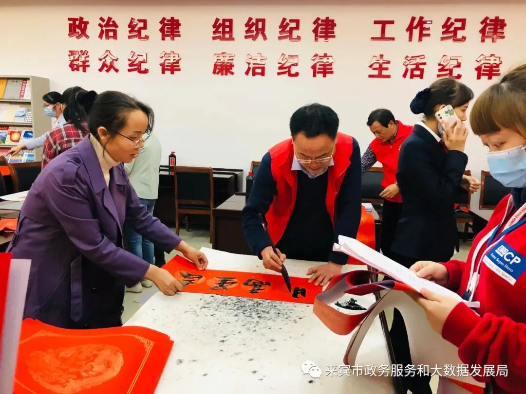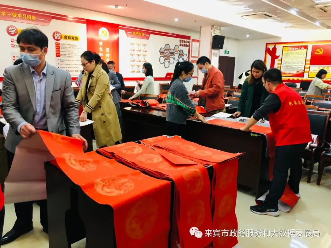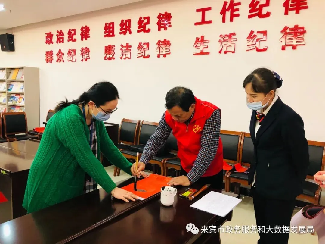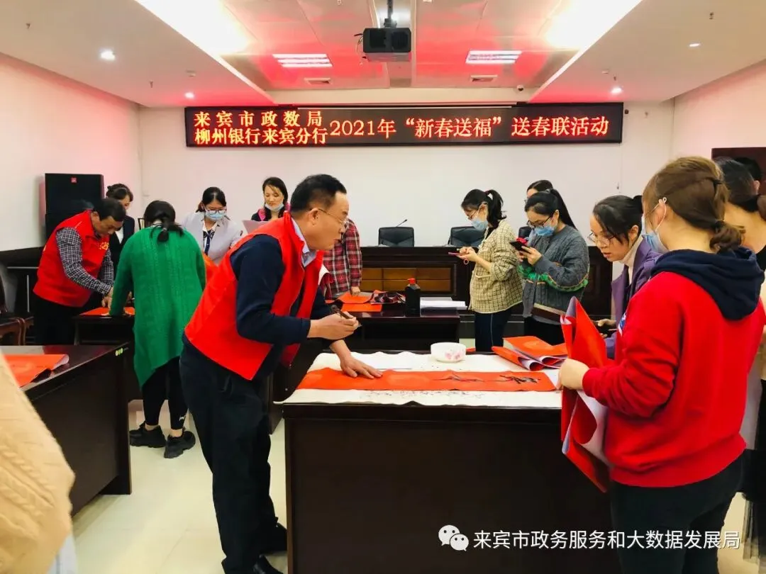 市政数局工会联手柳州银行来宾分行织书法爱好者开展“新春送福”送春联活动,为局机关、市信息中心、市公共资源交易中心、市政务服务中心、柳州银行办证厅支行的干部职工写春联,为职工送暖心服务,送新春祝福。