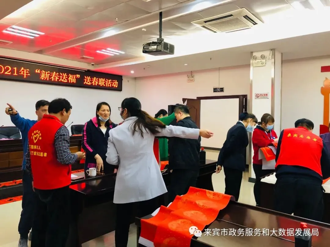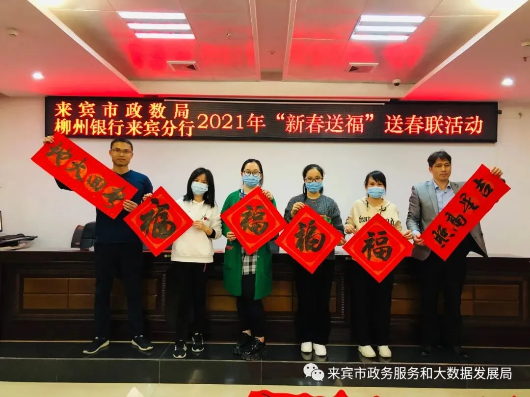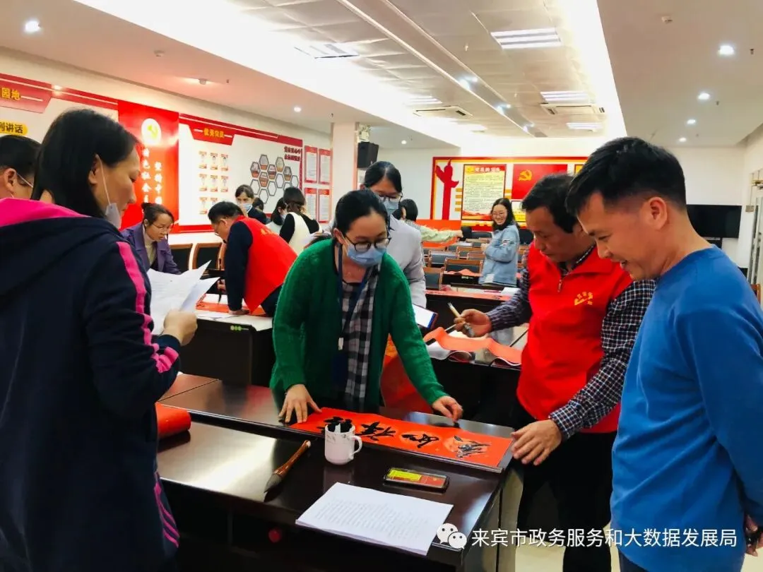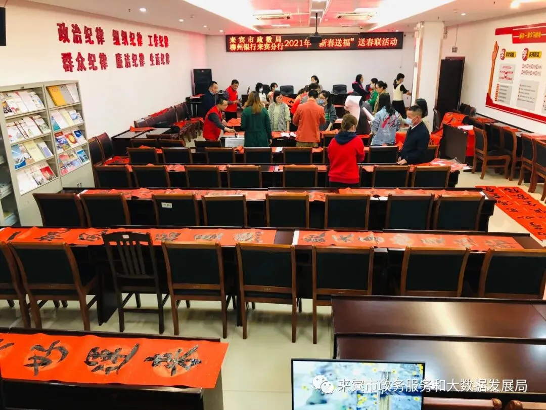 市政数局工会联手柳州银行来宾分行织书法爱好者开展“新春送福”送春联活动,为局机关、市信息中心、市公共资源交易中心、市政务服务中心、柳州银行办证厅支行的干部职工写春联,为职工送暖心服务,送新春祝福。