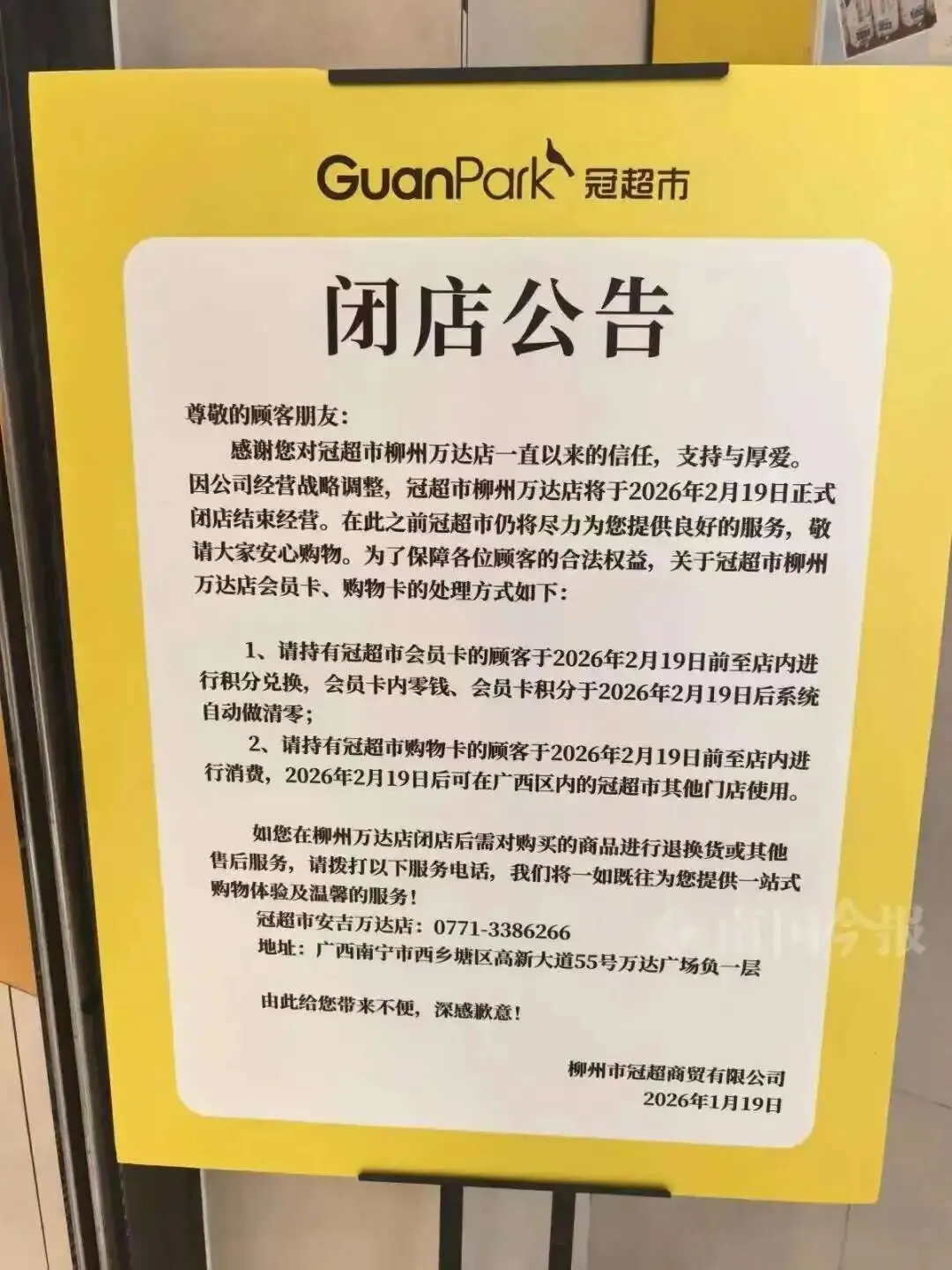 这两天位于柳州城中万达广场的冠超市贴出了闭店公告,一时间在市民之间传开了,引发了大家的讨论。公告里说的很清楚,这家冠超市将于2026年2月19日正式闭店结束经营,也就说还有一个来月的时间,这段时间大家可以正常购物。至于说会员卡以及购物卡怎么处理,公告里也做了说明,有会员卡的顾客在闭店前可以来店积分兑换,有人用8000多积分换了3瓶洗洁精还有洗衣液,挺不错的。购物卡里还有钱的顾客也在闭店前到店消费,没消费完的也可以在广西区内的冠超市其他门店使用。在他们的顾客服务群也发了相关的公告: