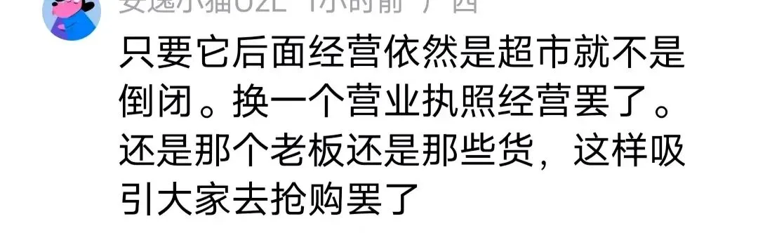 说到冠超市闭店这个事,店员说后续会有其他超市入驻,那有人就质疑了,是不是到时候换个营业执照就可以了,老板还是之前的老板。