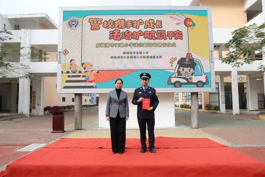颁奖结束后,举行法治副校长聘任仪式。防城港市公安局港口分局港城派出所教导员廖汝峻正式受聘为防城港市实验小学法治副校长,杨平校长为廖警官颁发聘任证书。随后,廖警官为全体师生带来了一堂生动形象的法治课,帮助师生了解校园暴力的定义与范畴,阐述了其对受害者身心的严重危害。他向学生传授应对技巧,强调遭遇欺凌要及时避险、留存证据并向师长报告,同时倡导“不做受害者、不做欺凌者、不做旁观者”。此外,廖警官还解读了相关法律条文,通过核算“打架成本”,警示学生暴力行为的法律后果。