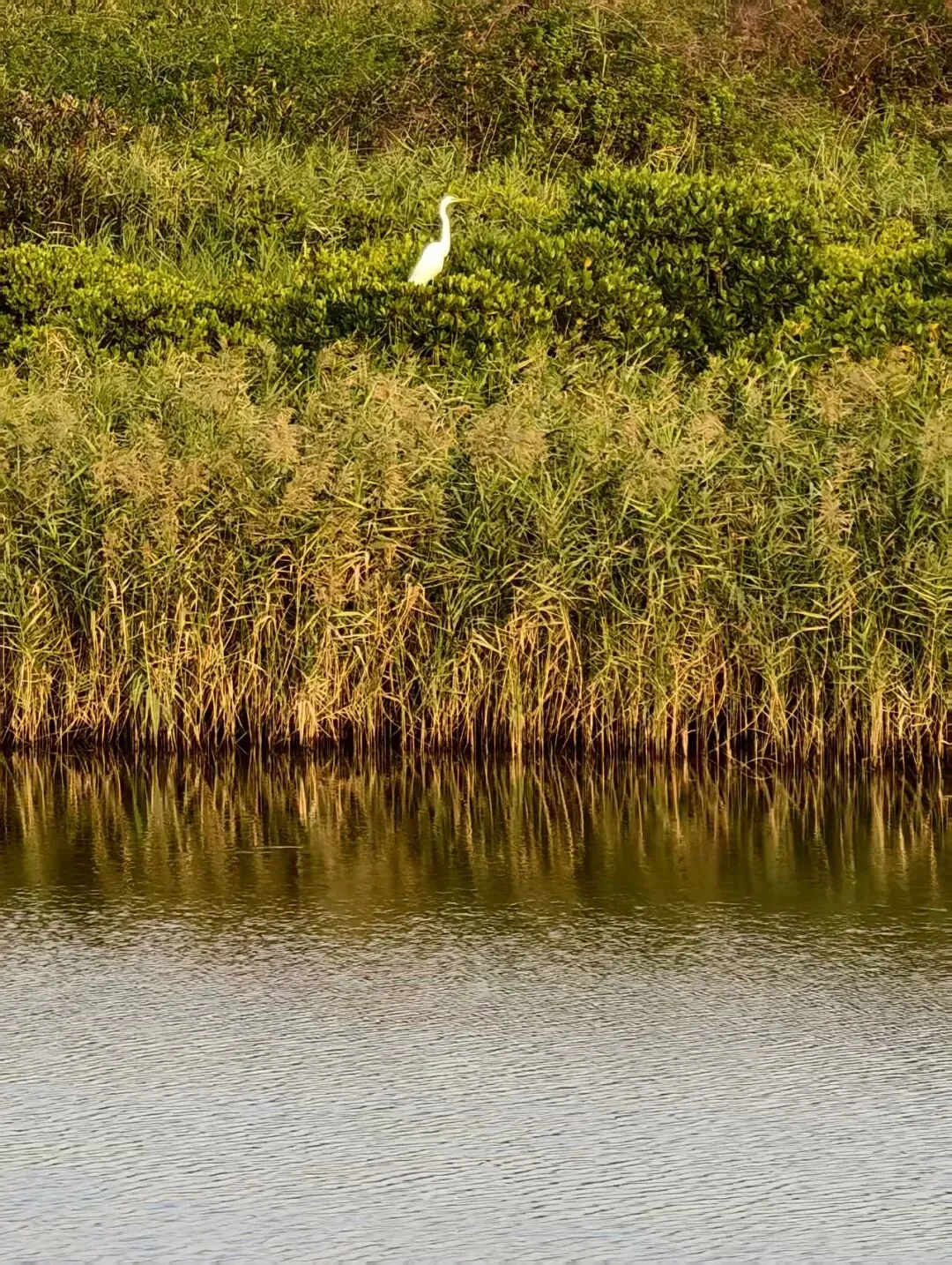 江道深处的芦苇荡,是沙潭江湿地公园的“精灵栖息地”。修长的苇秆在风中摇曳,雪白的白鹭时而伫立苇尖梳理羽毛,时而振翅掠过水面,惊起细碎的涟漪;它们或三两成群在浅滩踱步觅食,或结伴翱翔于江湾上空,羽翼在阳光下泛着温润光泽,为湿地注入灵动生机。
