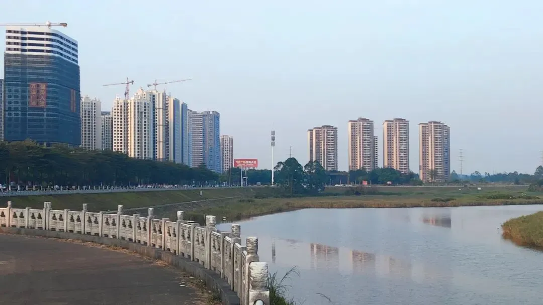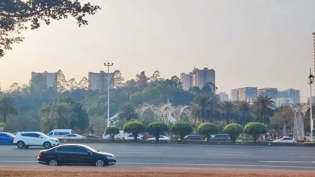 站在公园制高点北望,西北方向的公车镇区域轮廓清晰,楼群之间“万达广场强势入住”的条幅格外醒目,预示着片区的繁华升级。更令人心动的,是不时掠过天际的动车身影——一列列银灰色的动车组沿着防东铁路由北向南疾驰,奔赴边境之城东兴。