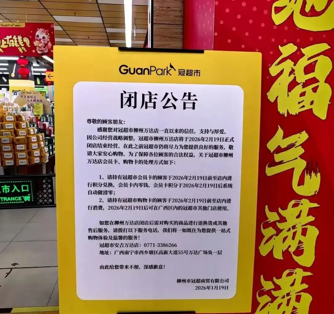 太突然了。柳州知名老牌超市宣布闭店,已经经营了10年之久。2026年1月19日,位于柳州市城中万达的冠超市门店贴出《闭店公告》表示,将于2026年2月19日正式闭店,结束经营。据闭店公告,因公司经营战略调整,冠超市柳州万达店将于2026年2月19日正式闭店,结束经营。公告表示,在闭店之前,冠超市仍将尽力为大家提供良好的服务,敬请大家安心购物。同时,为了保障各位顾客的合法权益,冠超市方面对柳州万达店会员卡、购物卡的处理进行了如下安排:1、请持有冠超市会员卡的顾客于2026年2月19日前至店内进行积分兑换,会员卡内零钱、会员卡积分于2026年2月19日后系统自动做清零;2、请持有冠超市购物卡的顾客于2026年2月19日前至店内进行消费,2026年2月19日后可在广西区内的冠超市其他门店使用。同时,在冠超市柳州万达店闭店后,顾客如果需要对购买的商品进行退换货或其他售后服务,可以联系冠超市南宁安吉万达店。据了解,冠超市柳州城中万达店于2015年11月27日随城中万达广场同步开业,至今在柳州已经经营了10年。我的好朋友九伍二柒在冠超市小程序上查询发现,冠超市柳州城中万达店是柳州市目前唯一的一家冠超市门店。也就是说,在本次门店关闭之后,柳州将没有冠超市门店了。需要注意的是,在2025年4月底,冠超市柳州城中万达店还花“重金”对门店进行了一次重装升级。可惜的是,升级后还不到一年的时间,如今却宣布闭店了,也是让人唏嘘不已。相关信息显示,冠超市属于福建冠业投资发展有限公司旗下品牌,于1999年在福建省福州市创立。经过20多年的发展,冠超市已经成为了跨越福建、广西、云南等省区的大型商超集团公司,进入中国快速消费品连锁百强,并成为受国内城市商业综合体欢迎的主力品牌之一。不过,近年冠超市也曾传出一些负面信息。比如在2024年期间,冠超市平潭万宝店因食品安全问题发布食品召回公告,平潭世界城店因食品安全问题两次发布食品召回公告。小伙伴们,你们对冠超市柳州城中万达店闭店结束经营怎么看呢?一起聊一聊。—-—这里是信息分割线—-—