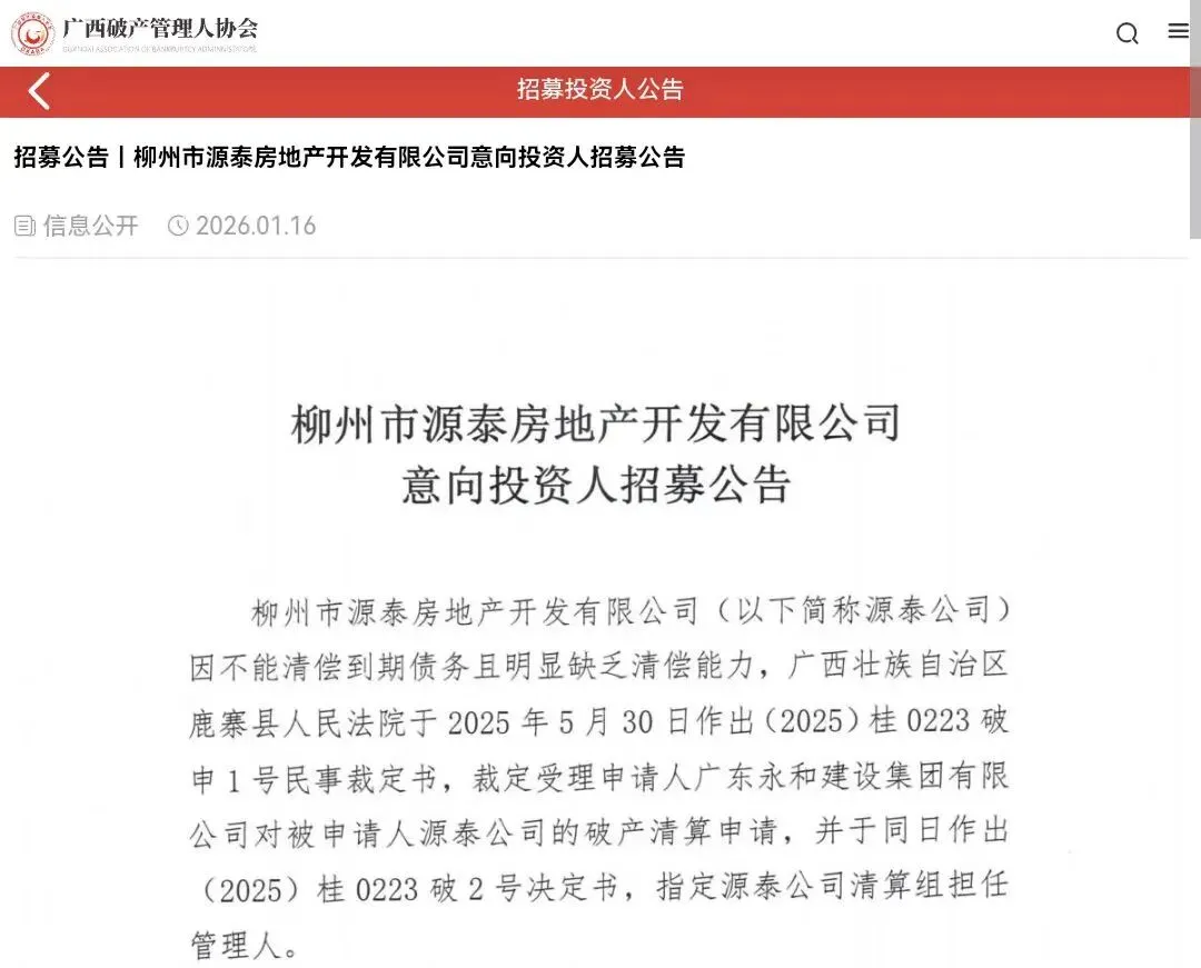 近日,柳州一家房地产企业被裁定破产清算,为最大限度维护债权人合法权益,同时保障购房业主权益,该企业管理人发布招募公告,面向社会公开招募意向投资人。