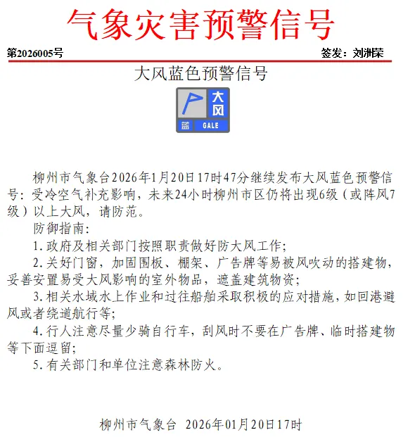 柳州市气象台1月20日17时47分继续发布大风蓝色预警信号:受冷空气补充影响,未来24小时柳州市区仍将出现6级(或阵风7级)以上大风,请防范。