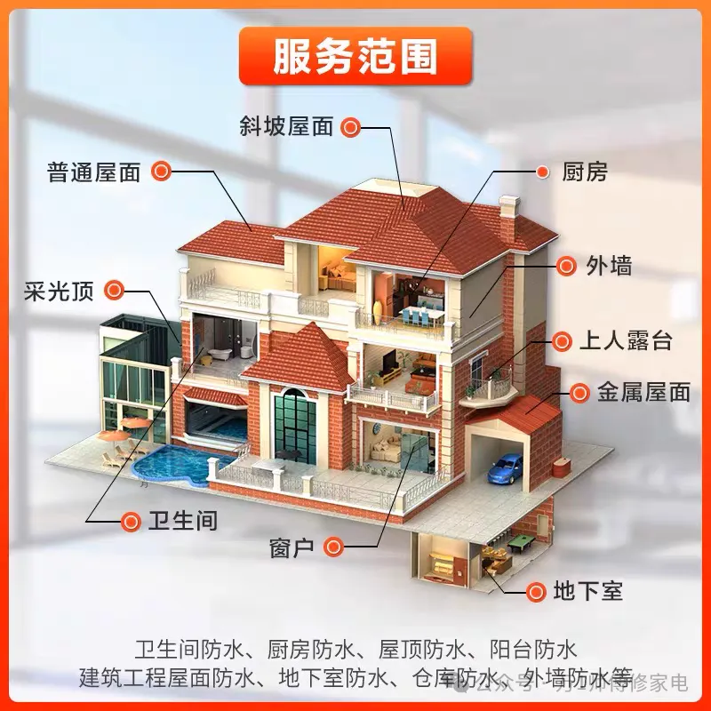 不管您是卫生间漏水、厨房漏水、楼顶漏水、墙体发霉起皮、外墙漏水、阳台漏水,我们都能解决。
