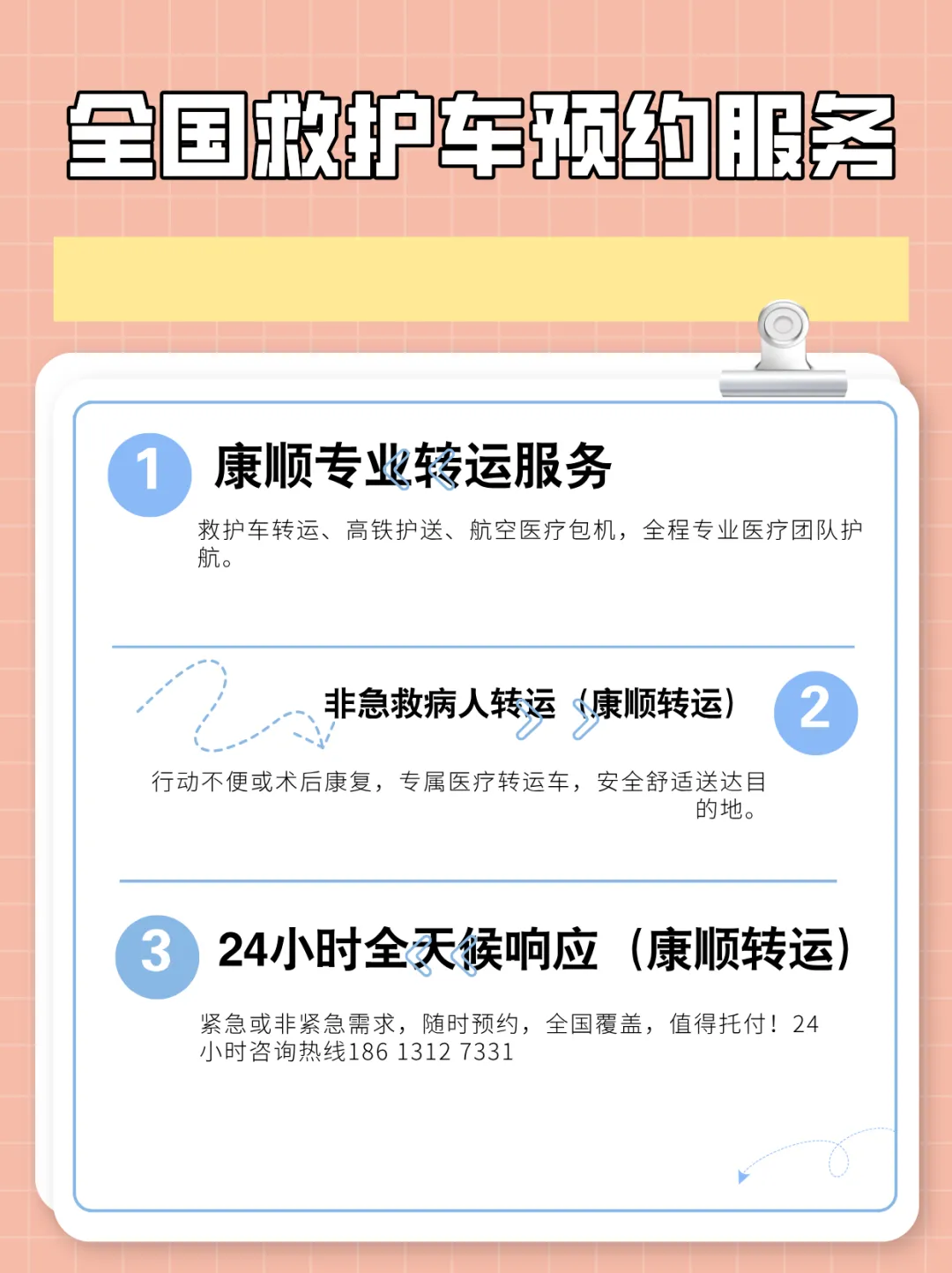 咨询或预约请拨18613127331(微信同号),专业提供非急救医疗转运服务,24小时待命,安全护送每一位患者。