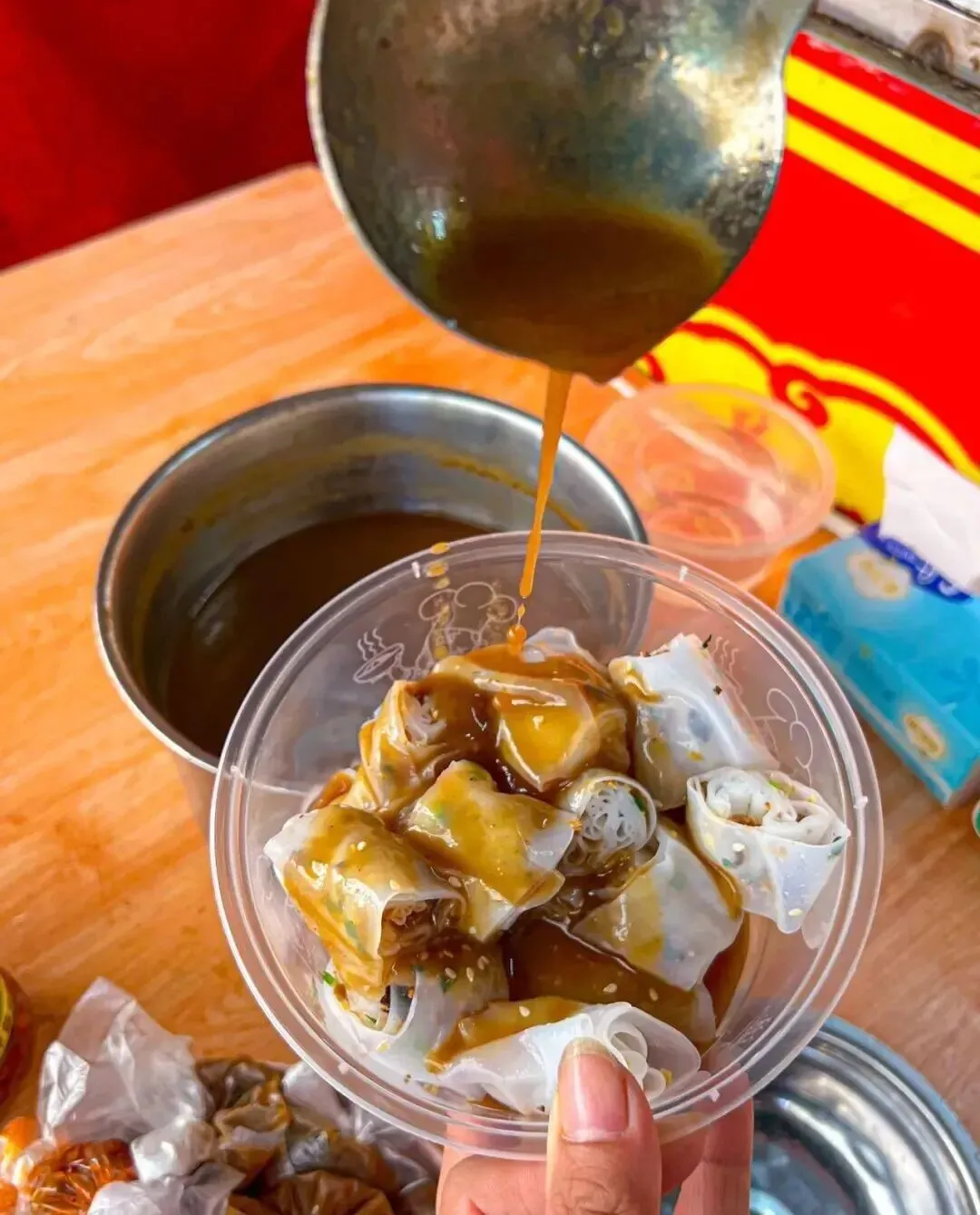 我试过在新住的地方附近找 , 找了好几家卷筒粉 , 味道都不太对 , 要么粉皮太厚 , 要么馅料敷衍 , 要么酱汁寡淡。