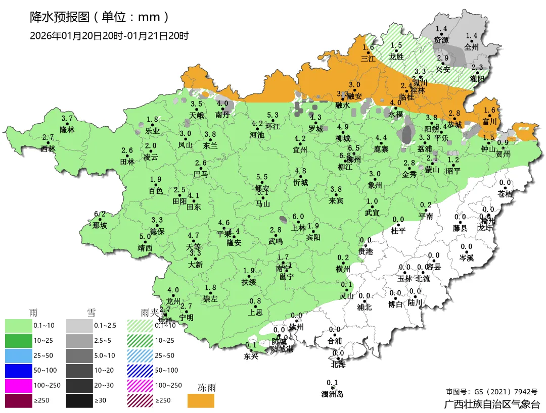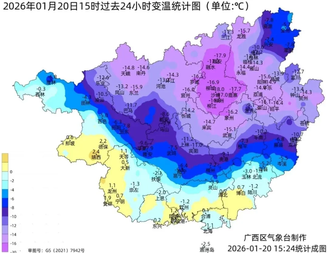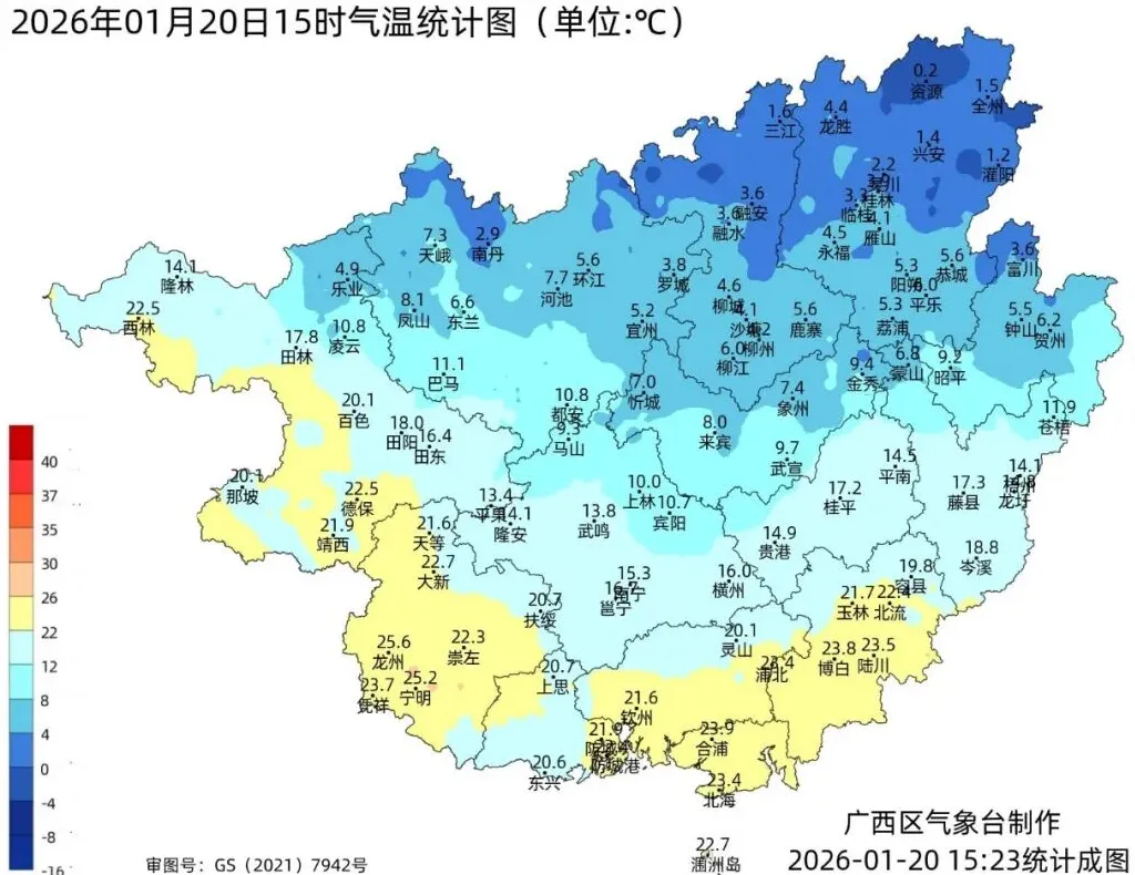 最低气温的话是出现在22日的早上,高寒山区的最低温度要达到-7℃到-1℃,桂北的话是-1℃到4℃,桂中的话是4℃到7℃,桂南的话达到7℃到11℃。