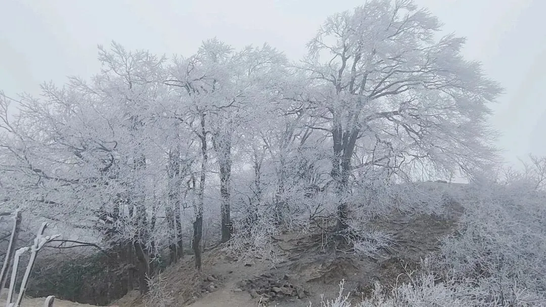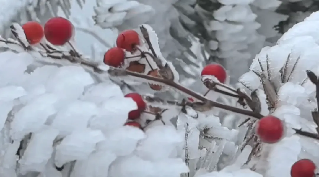 道路两侧的树木、灌木挂满了晶莹的冰棱,原本翠绿的枝叶被冰层包裹,形成了“冰挂”景观;路边的护栏、标志杆也凝结着薄冰,用手触摸冰凉刺骨。