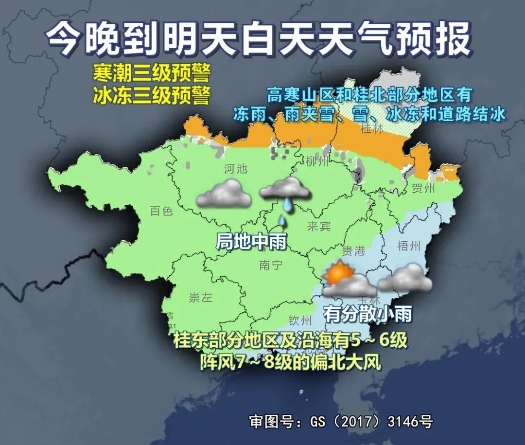 受这一次强冷空气的影响,第一个是要做好防寒保暖,第二个是桂东还有沿海以及北部湾海面会有大风,要注意防风,另外一个由于高寒山区还有桂北的部分地区会出现道路结冰,出行的时候要注意交通安全。