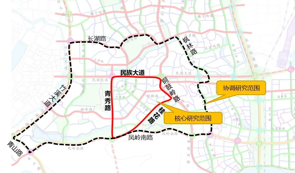 简而言之,该《规划》将在民族大道-铜鼓岭路-桂花路-青秀路围合区域,打造“轨道+地下空间+地面交通”三位一体的立体交通体系,规划年限为2025-2035年。
