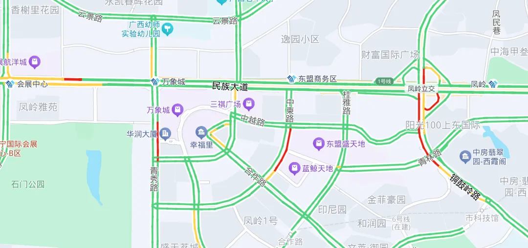 比如你在民族影城看完电影,想要回位于凤岭北的家。如遇上下班高峰期,你是“不敢”走万象城前面的青秀路,那里常堵得水泄不通,只能绕凤岭立交掉头,很是不便。
